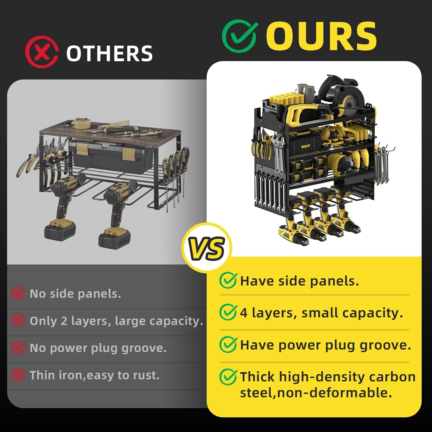 - đ§ăLARGE CAPACITY&SIDE PLATESăThis wall-mounted power tool organizer is more storage space than standard tool racks.It has 4-layer high-capacity design and 4 cordless drill holders and 2 side-plates,great for storge electric drills/power drivers/impact wrenches/mpact drills/cutters/angle grinders and other handheld power tools.The 4-layer can hold batteries, saws,wrenches,chargers and other tools, and the side racks can hold wrenches/screwdrivers/hammers/pliers,scissors,etc.