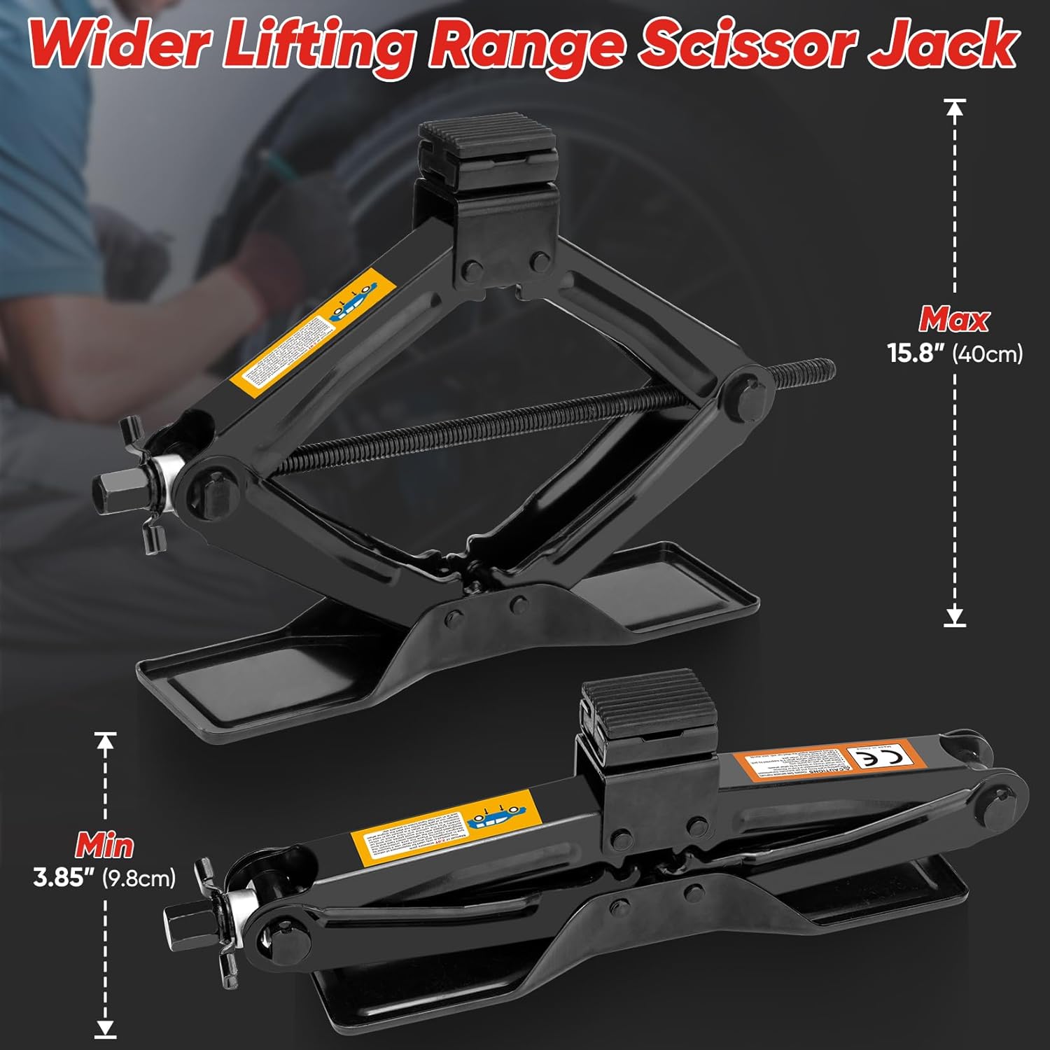 - [Adjustable Widely Lifting Range] With a lifting range from 3.85''(98 mm) to 15.8''(400 mm), the scissor lift jack provides a wider range to reach under low-chassis sedans or elevate high-body SUVs effortlessly