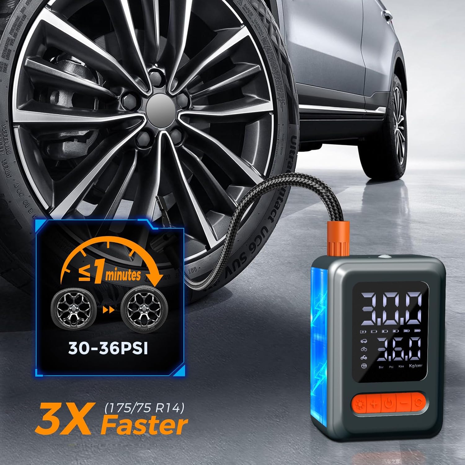 - 3X FASTER INFLATION: Powools portable air pump is born with a powerful motor and a high-performance chip, providing a maximum pressure of 150PSI and a strong airflow. This portable tire inflator for cars can pump up a standard car tire from 30 to 36PSI in less than 1 minute, offering 3X faster inflation than others. It can save you valuable time in emergencies or routine maintenance.