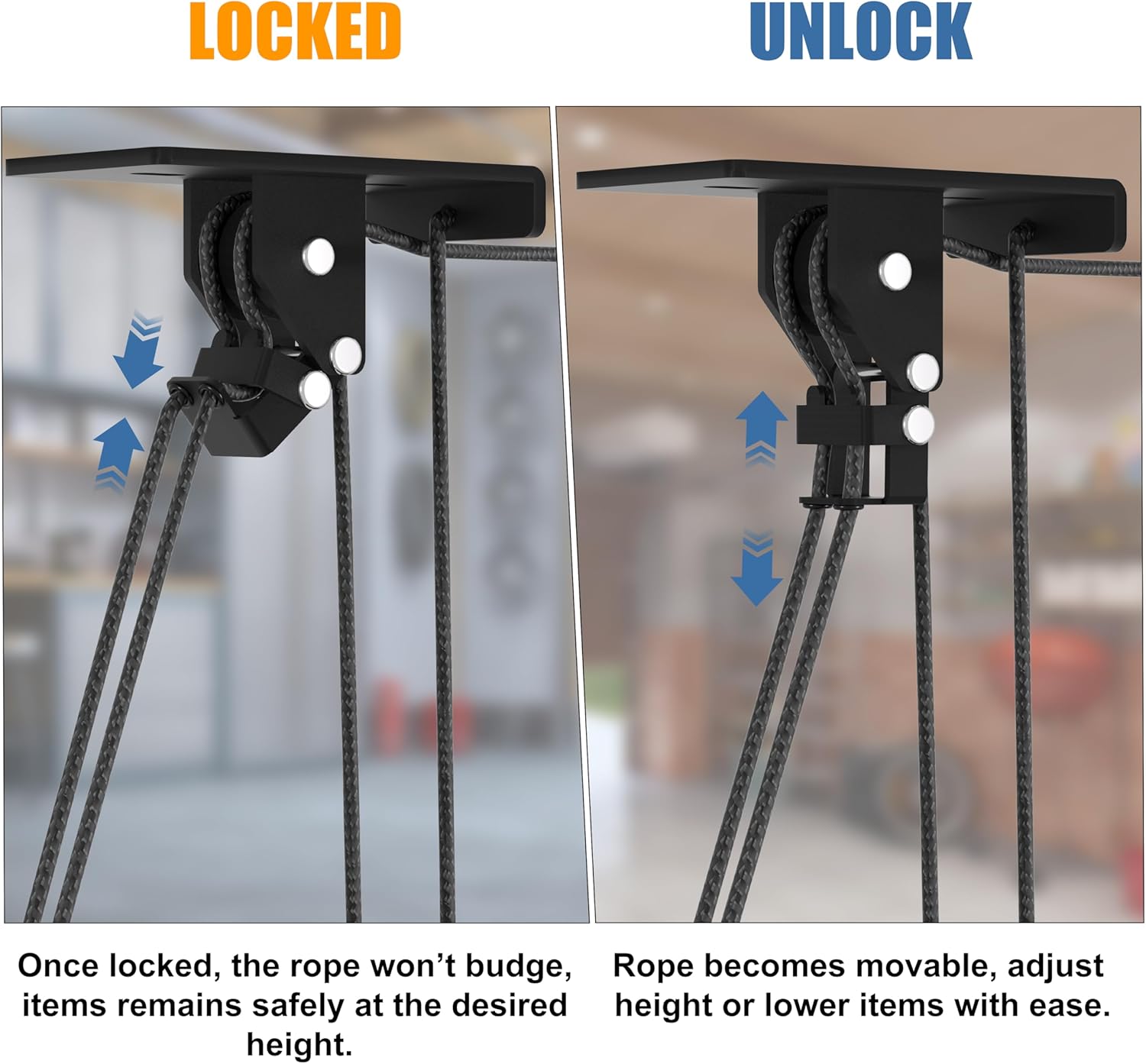 - HEAVY-DUTY CONSTRUCTION: Built with thick steel components and high-strength rope, this cargo box ceiling storage hoist safely supports up to 150 lbs. The mechanical advantage combined with an extra-long 20-meter rope ensures smooth, effortless lifting even in garages with tall ceilings for long-lasting, reliable performance.