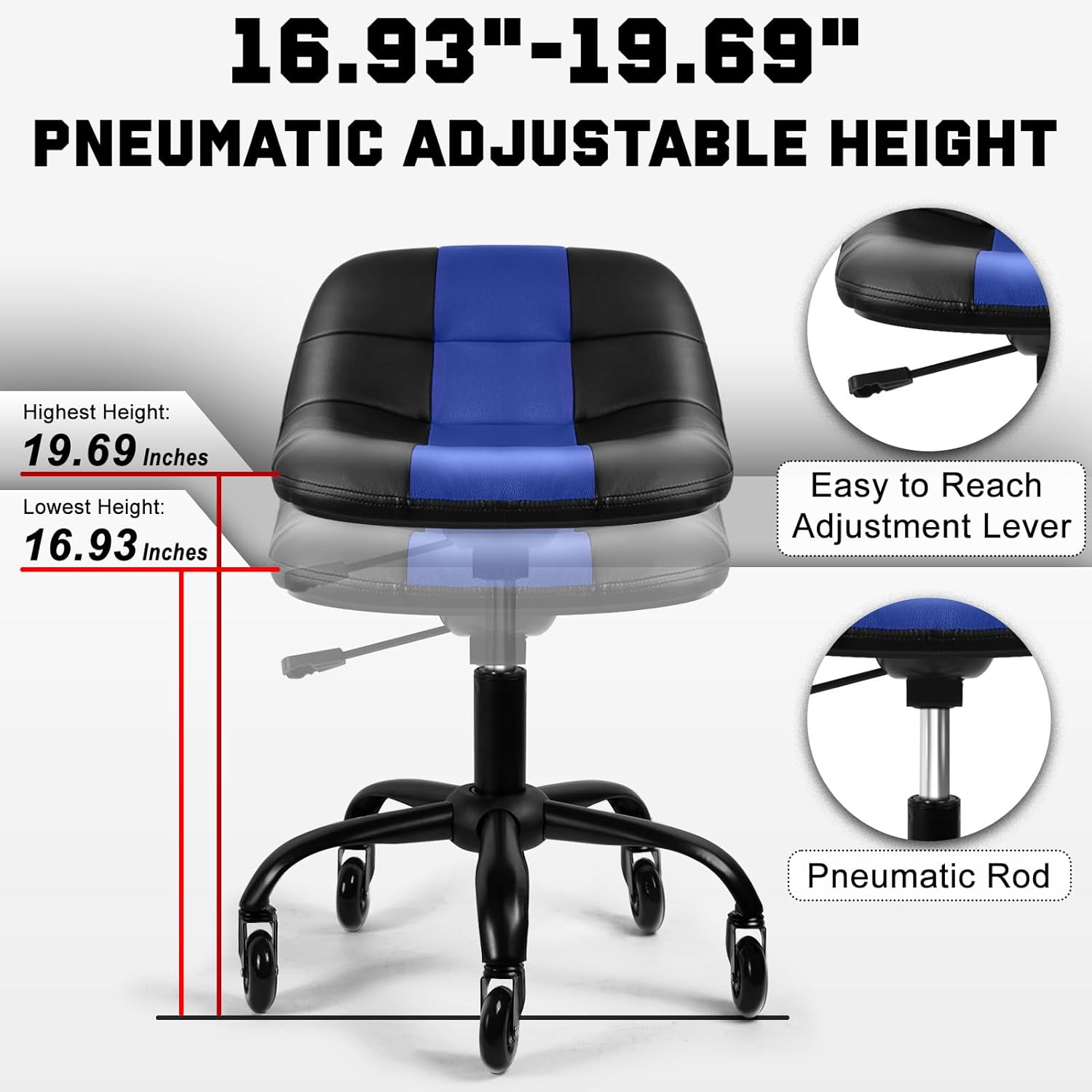 Rolling Stool with Wheels, Garage Shop Stool with Backrest, Roller Seat with Pneumatic Adjustable Height 16.93"-19.69", Heavy Duty Multi-Purpose Chair for Shop Salon Office Home, Blue
