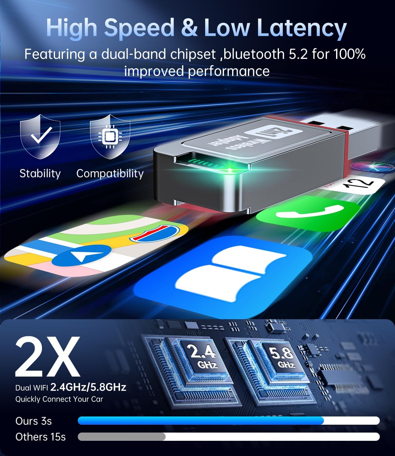 - ăDual-Band Wi-Fi, High Speed & Low Latencyă This car play wireless adapter Featuring a 2.4GHz + 5.8GHz dual-band chipset ,bluetooth 5.2 for 100% improved performance, optimized for fast data transfer.