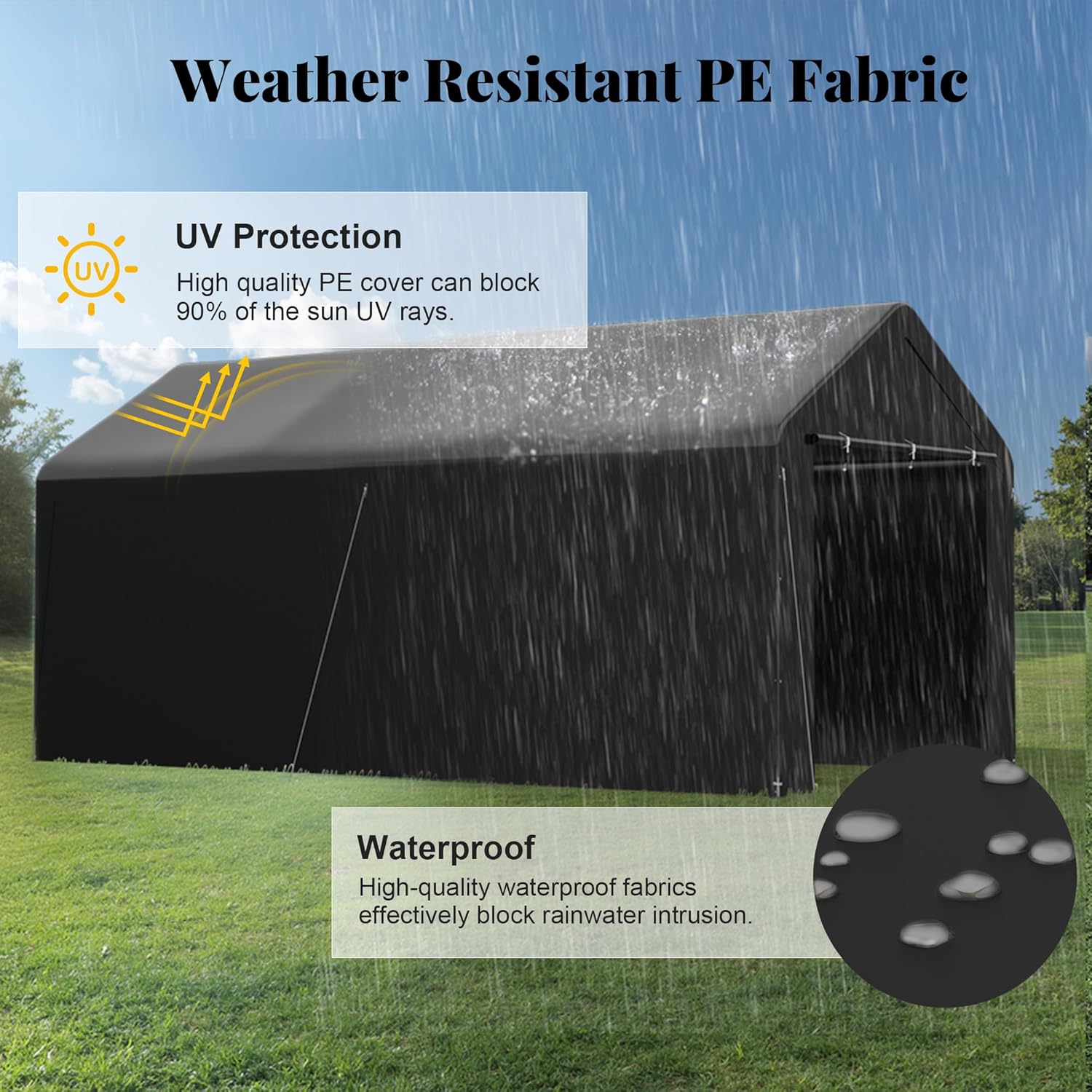 - 【UV & Weatherproof Canopy】This 10x20 carport is made of heat-sealed, triple-layer 200g polyethylene fabric, which is Anti-UV, waterproof, tear-proof, and can protect your car or boats against all four season elements, like sun, wind, rain, dust, hail, and snow.