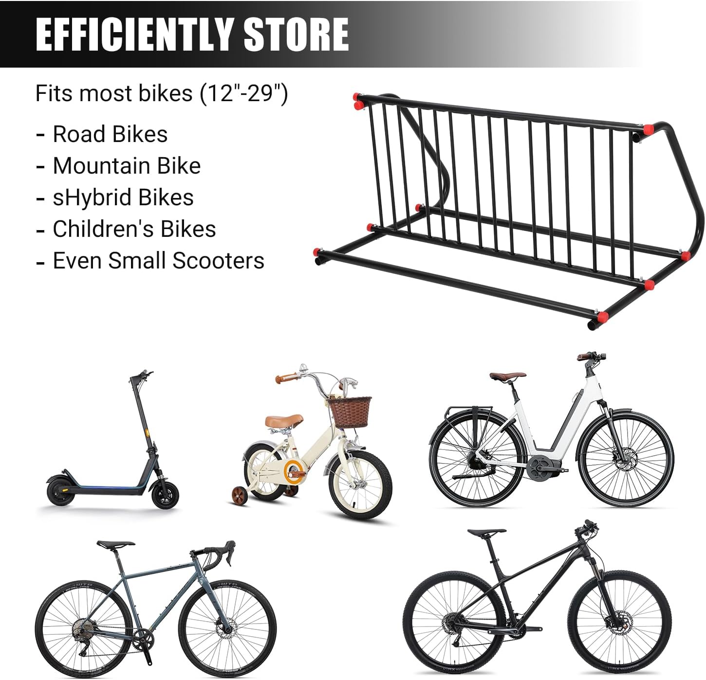 - [VERSATILE PARKING SOLUTION] From car bike transport to commercial floor bike racks, this stand adapts to any need. Use in garages, retail spaces, or outdoor areas for tidy, secure bicycle parking.