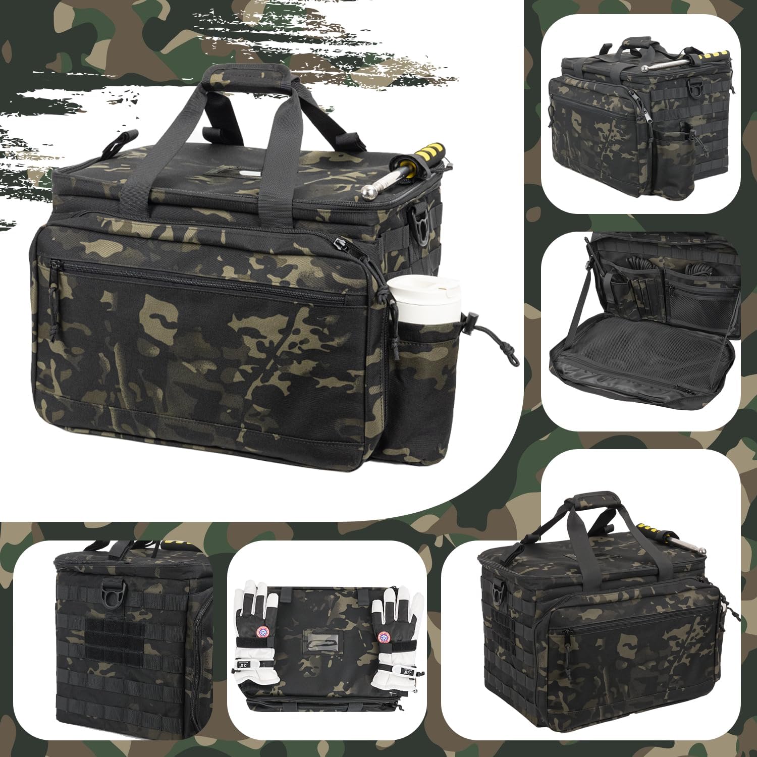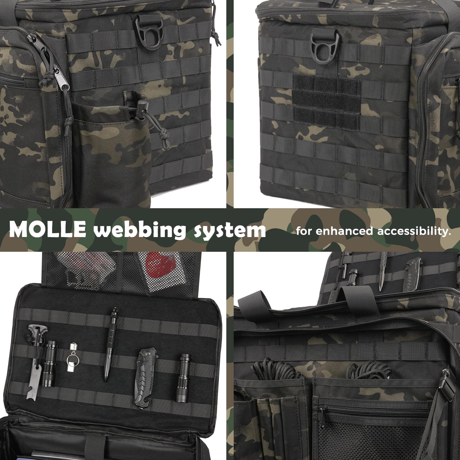 - Dedicated Work Area: Multiple compartments and pockets provide sufficient space for essentials such as tactical gear, notebooks, keys, sunglasses, gloves, ammunition and flashlights. Despite the capacity, the bag remains compact and portable, with a durable structure ensuring secure storage and easy access. Its rugged build, sturdy zippers, and thoughtful design ensure durability and practical organization.