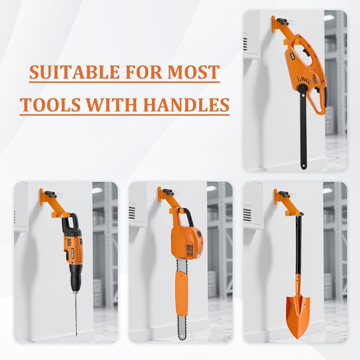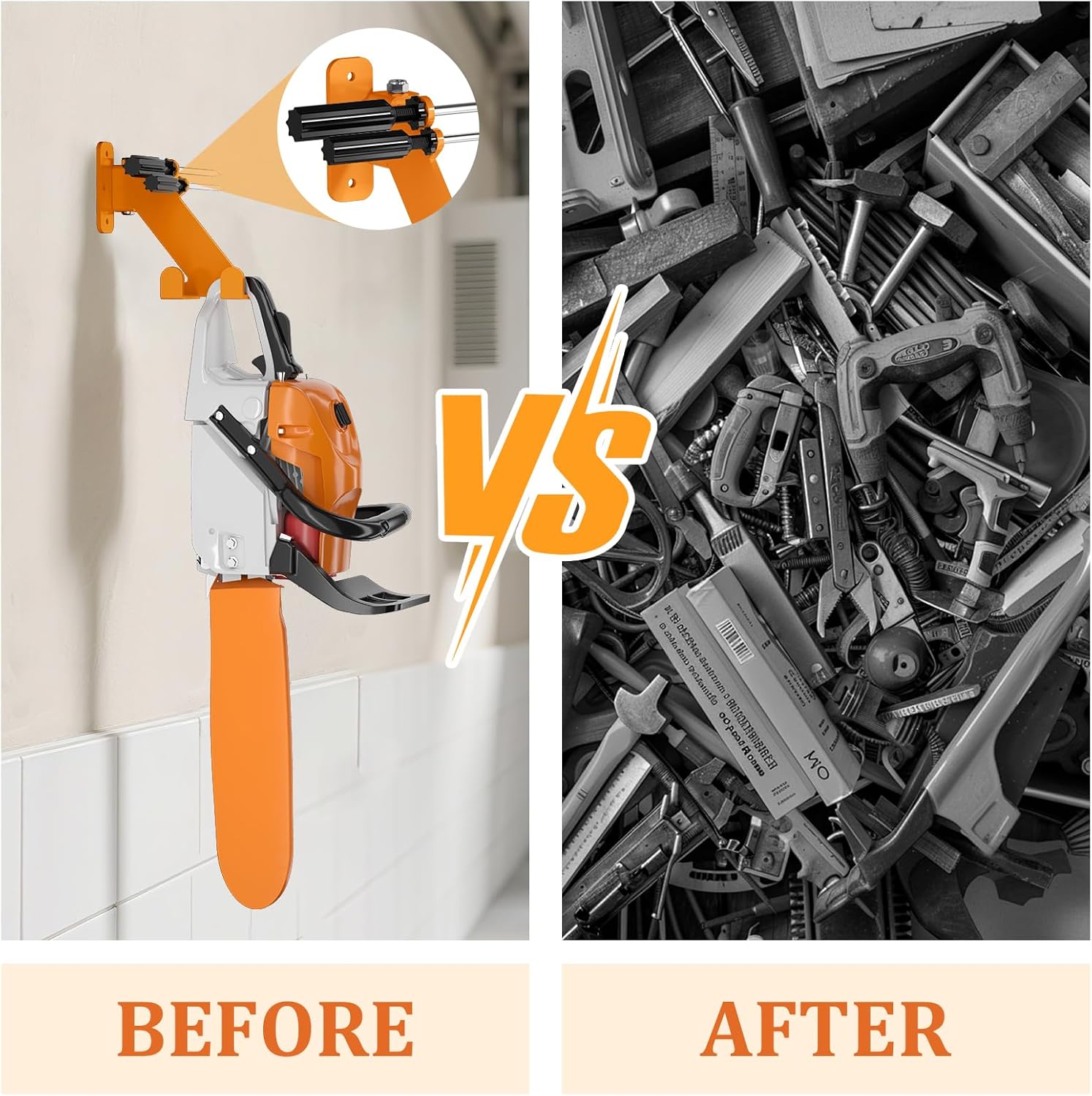 - Versatile Hanging Options: This chainsaw wall mount features a unique horizontal or vertical design, allowing you to hang your chainsaw in either orientation for flexible storage. The two-hole organizer keeps chainsaw wrenches and accessories neatly in place, while the adjustable hook accommodates various handle sizes