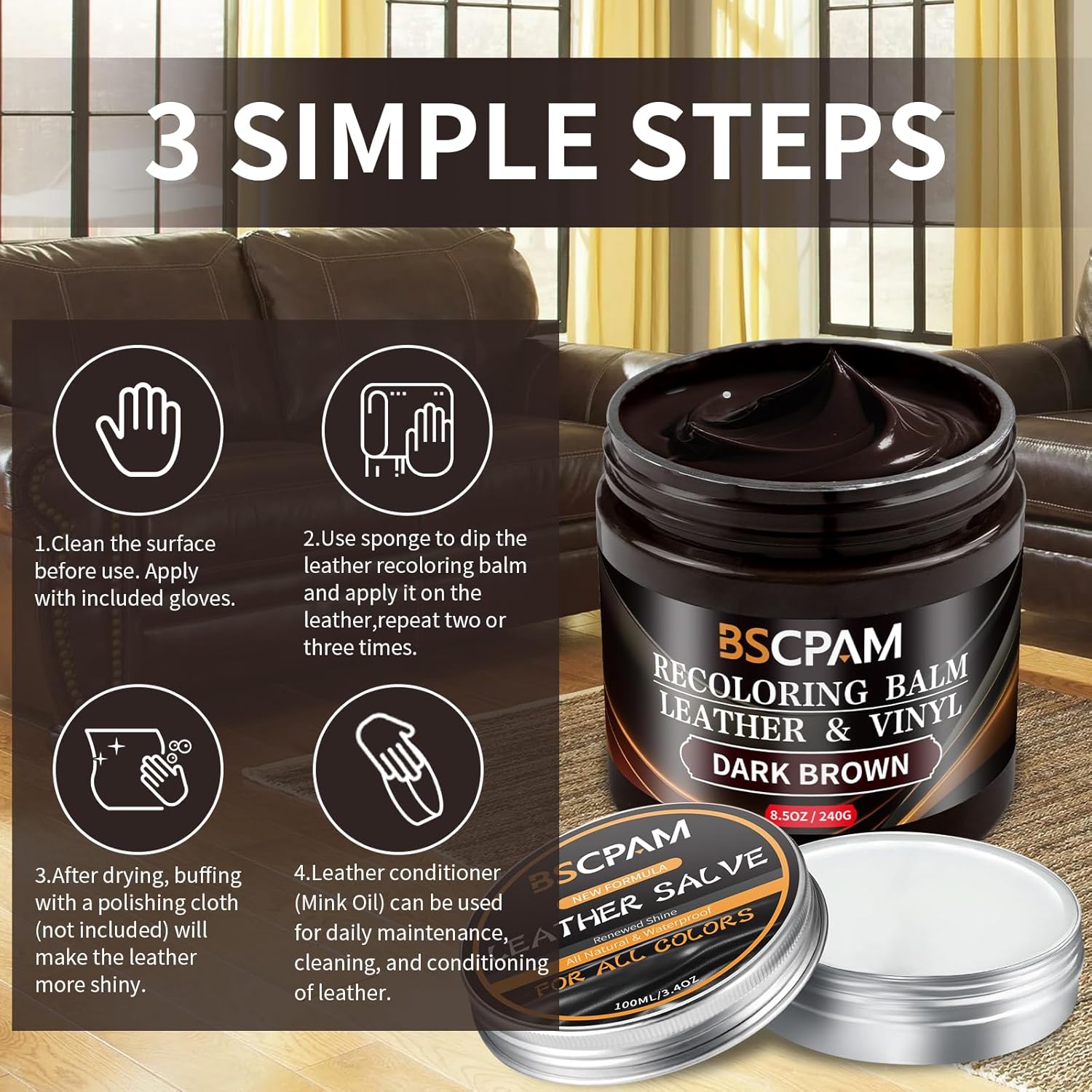- Leather Repair Kit for Furniture: Our Leather Color Restorer kit with Mink Oil is formulated for quick and easy application, providing comprehensive care for your leather furniture. This Leather Recoloring Balm and Repair Kit is designed to restore leather surfaces to their former glory, enhancing longevity and maintaining a vibrant appearance