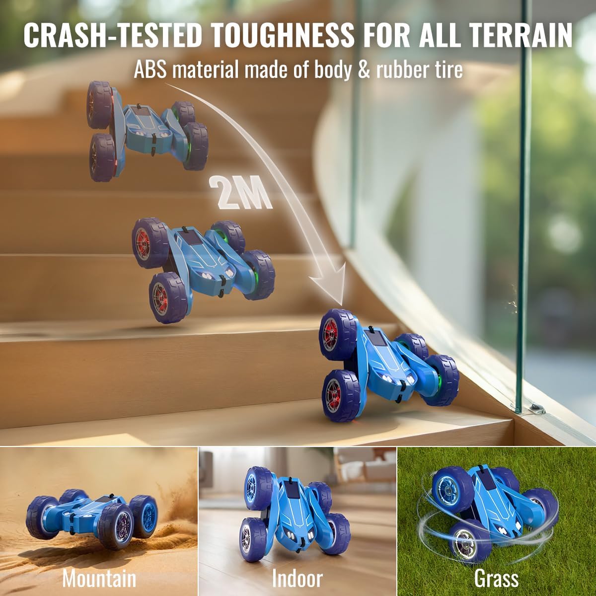 - Thrilling Stunts & All Terrain - Builted Master 360° spins, 180° flips, and double-sided driving for endless stunt excitement. Powerful motor enables it unleash 20km/h high speed on rough terrain with 4WD traction and durable rubber tiers for maximum grip and shock absorption.