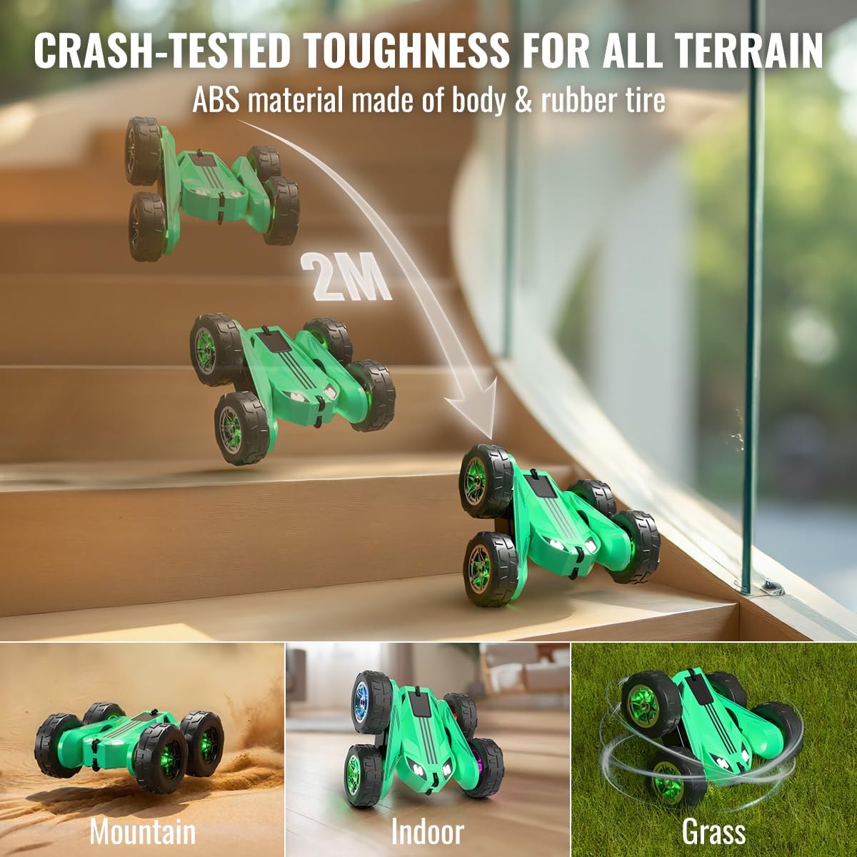 - Thrilling Stunts & All Terrain - Builted Master 360° spins, 180° flips, and double-sided driving for endless stunt excitement. Powerful motor enables it unleash 20km/h high speed on rough terrain with 4WD traction and durable rubber tiers for maximum grip and shock absorption.