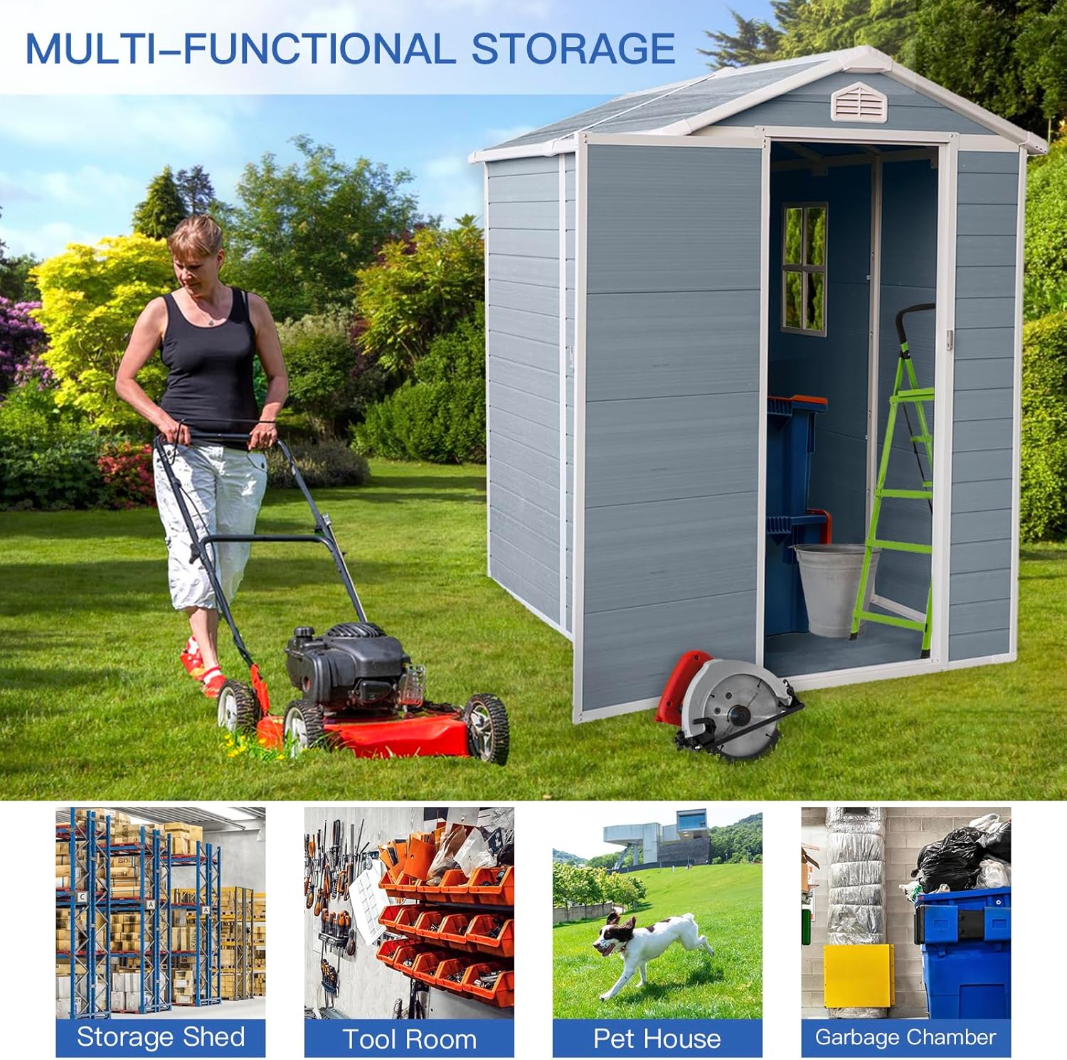 4x6 FT Outdoor Storage Shed, Resin Garden Shed with Thick Floor, Plastic Storage Shed with Window, Waterproof Outside Tool Shed with Lockable Hinged Door for Backyard, Patio, Lawn, Light Gray