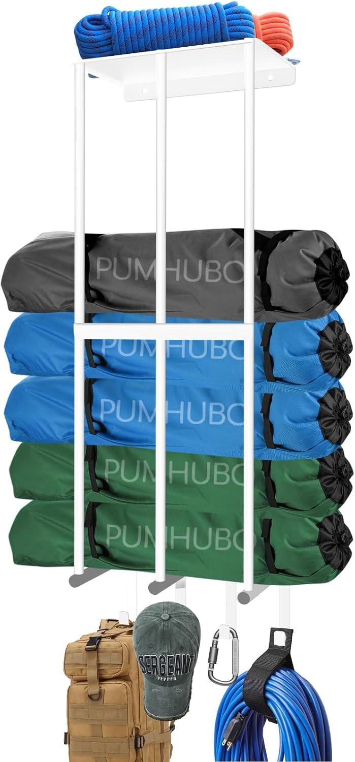 - Multi-Purpose: Garage hanging storage shelves are equipped with floating shelves for storing smaller items such as mountain bike caps. The all-in-one design is perfect for placing beach umbrellas, poles, pipes, yoga mats, or other long items. The lower 4 hooks are used to hang D-buckles, hammock bags, ropes, hiking bags, etc