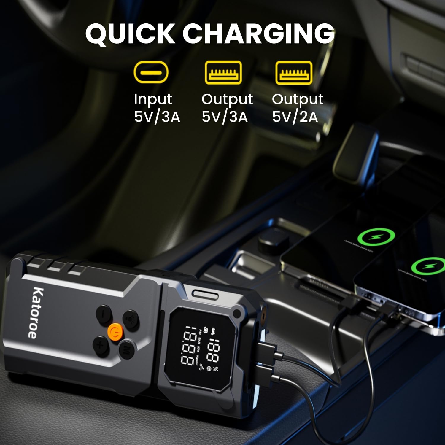- Cordless Inflator - The jump starter with air compressor can quickly inflates a car tire from 0 psi to 20 psi in 2 minutes. Equipped with 3 different nozzles & 4 selectable units (PSI, BAR, KPA, KG/cm²) for cars, bicycle, motorcycle, balls etc. The display screen can display the tire pressure in real time, convenient for inflating your vehicle. Get rid of the annoyance of low tire pressure during travel.