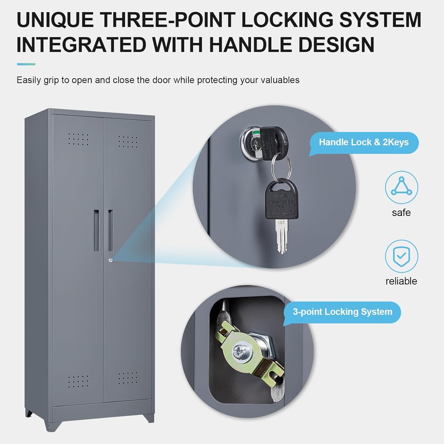 - 【User-Friendly Design】The bottom of the broom metal cabinets with locking doors and adjustable Shelves is made of stainless steel, which is corrosion-resistant and easy to clean. The ventilation holes on the panel prevent moisture and allow breathability, keeping the interior dry and reducing odors. The four standing feet enhance the stability of the cabinet and make it easier to clean underneath.