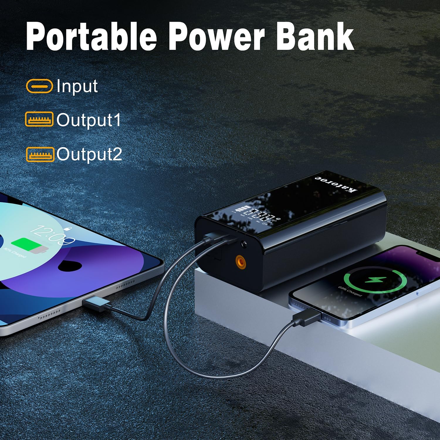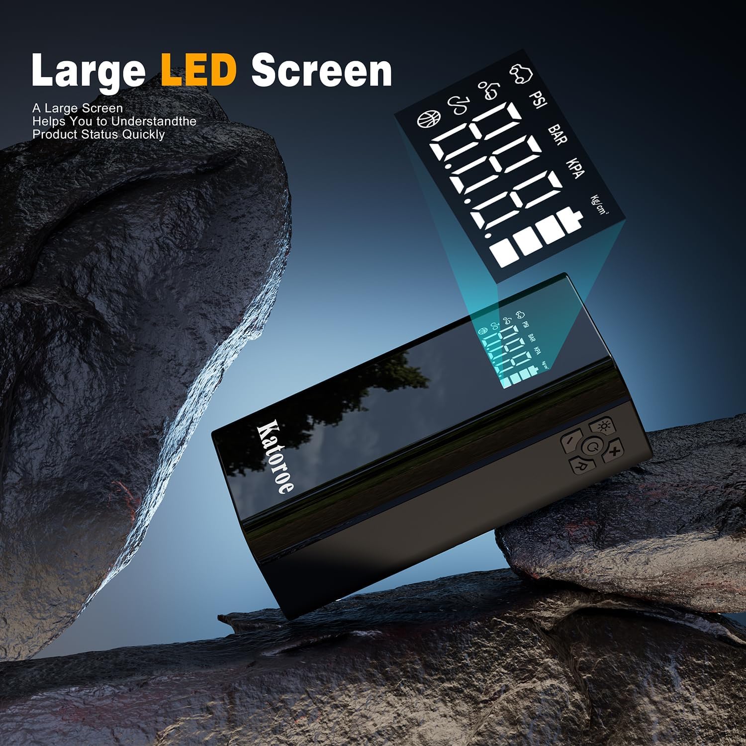 - ăCORDLESS INFLATOR & SMART DISPLAYăThe jump starter with air compressor quickly inflates a car tire to 30 PSI in just 2 minutes, faster than most jump starter in the market. Equipped with 3 different nozzles & 4 selectable units (PSI, BAR, KPA, KG/cm²) for cars, bicycle, bikes, motorcycle, balls etc. The display screen can display the tire pressure and power in real time, easy to inflate your cars. Do not need to worry about the tire pressure after you purchased our jump starter.