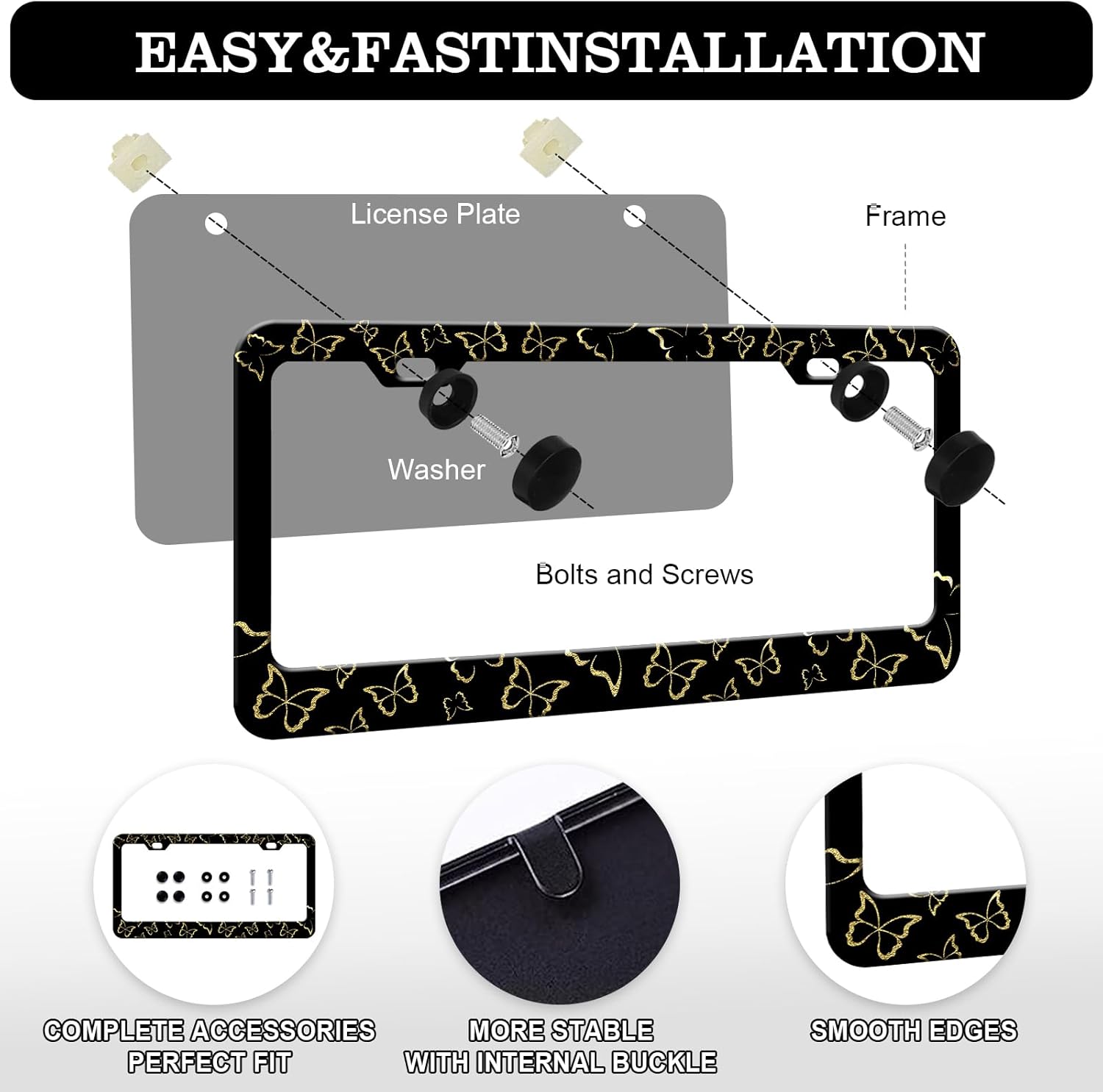 - Easy to Instal: The car license plate frame includes accessories, nuts, anti-theft screws, and comes with installation hardware, including all accessories shown in the figure;The license plate frame is easy to install without any special tools