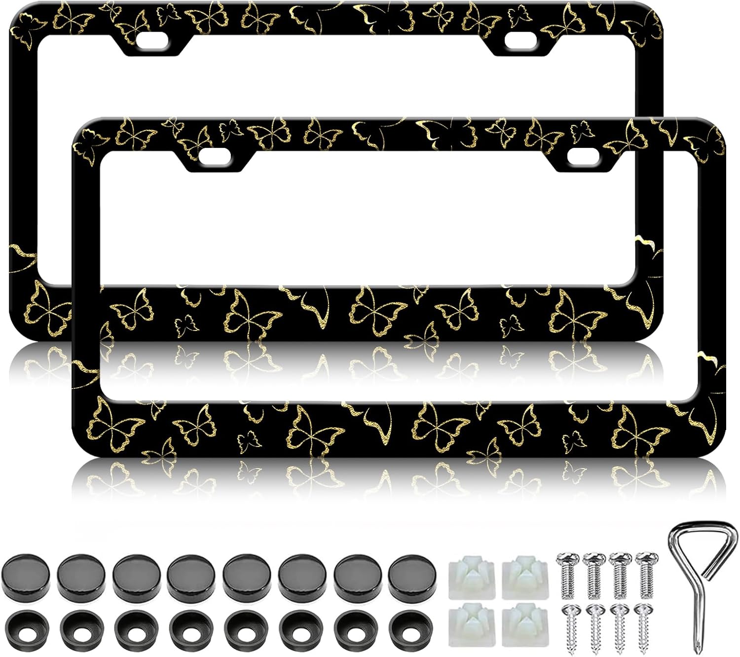 Golden Butterfly License Plate Frames - 2 Pack Beautiful Butterfly Stainless Steel License Plate Holder,Rust-Proof Waterproof Car Decorative Tag Frame with Screws Fasteners Caps
