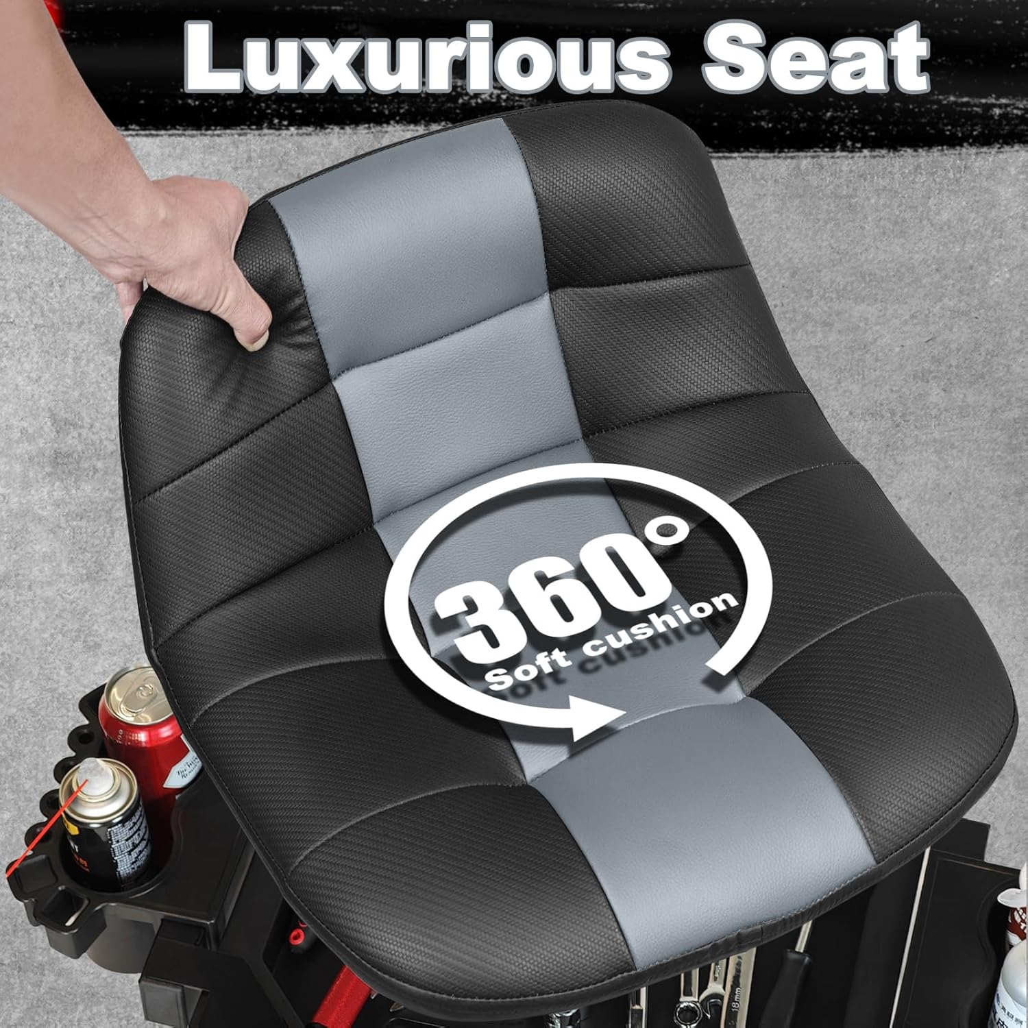 - Enough Stroage Space: The Mobile Rolling Shop Stool is equipped with 1 black plastic storage tray and 2 Cup & Tools side holders. At the same time, we have set up dedicated placement areas for small parts. With ample storage, you can carry your supplies with you while working, like important car care or repair supplies