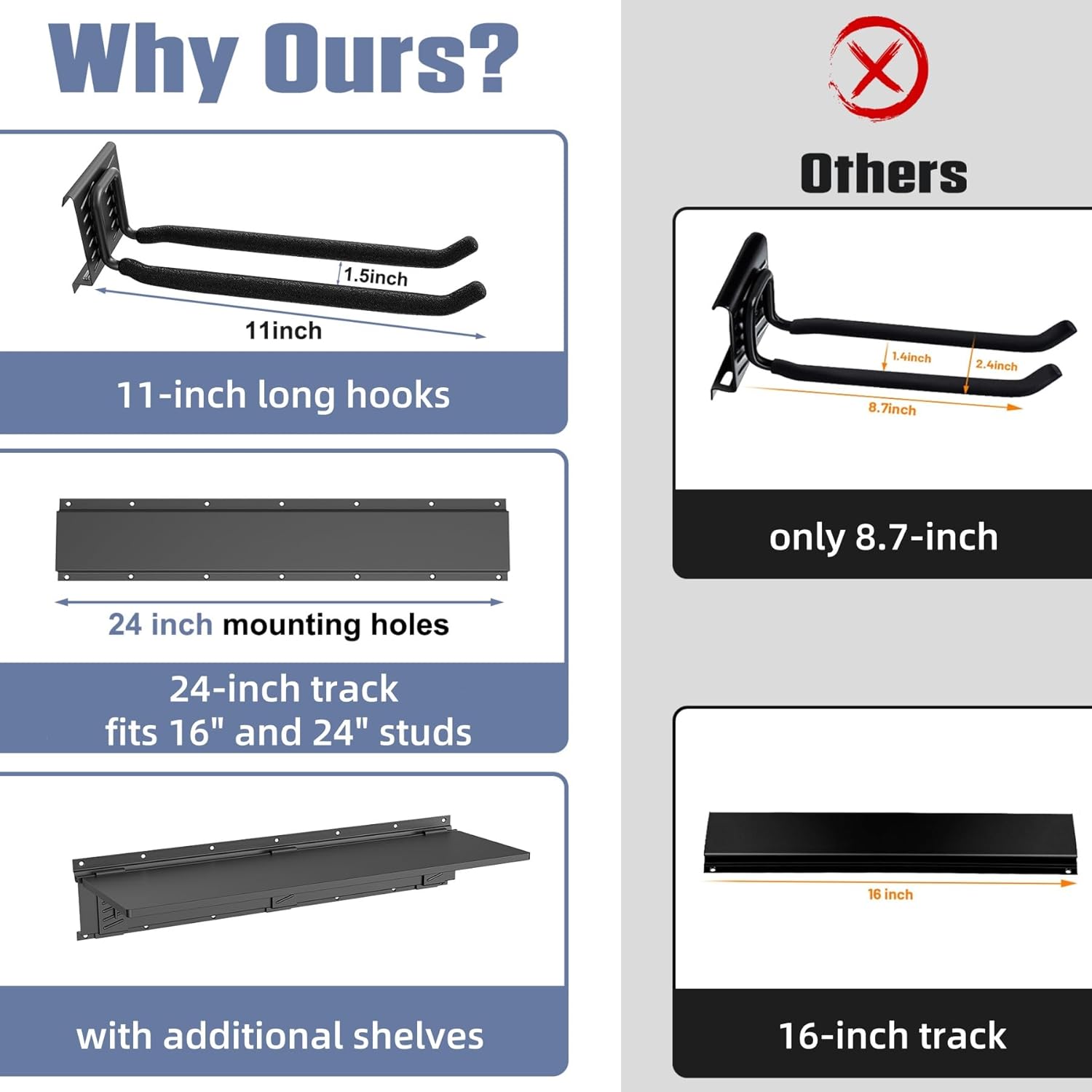 - 6 Heavy-Duty Double-Prong Hooks: Each 11-inch hook holds 3-5 tools or 4-5 folding chairs, providing efficient storage for various items. Designed for secure and accessible organization