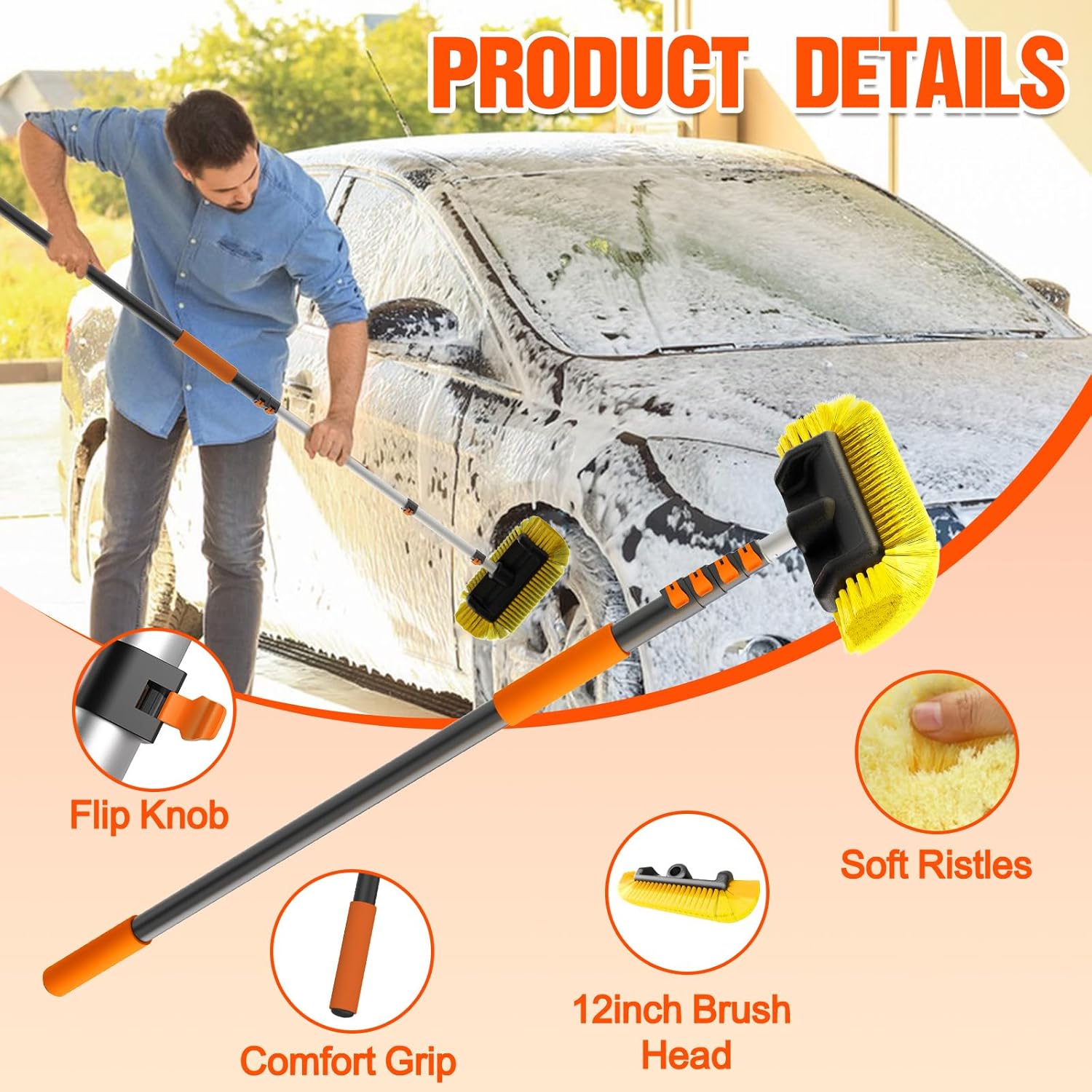 16FT Car Wash Brush with Long Handle, Car Cleaning Brush with 12 Inch Soft Bristle, Solar Panels Cleaner with Telescoping Pole for RV, Truck, Boat, House Siding
