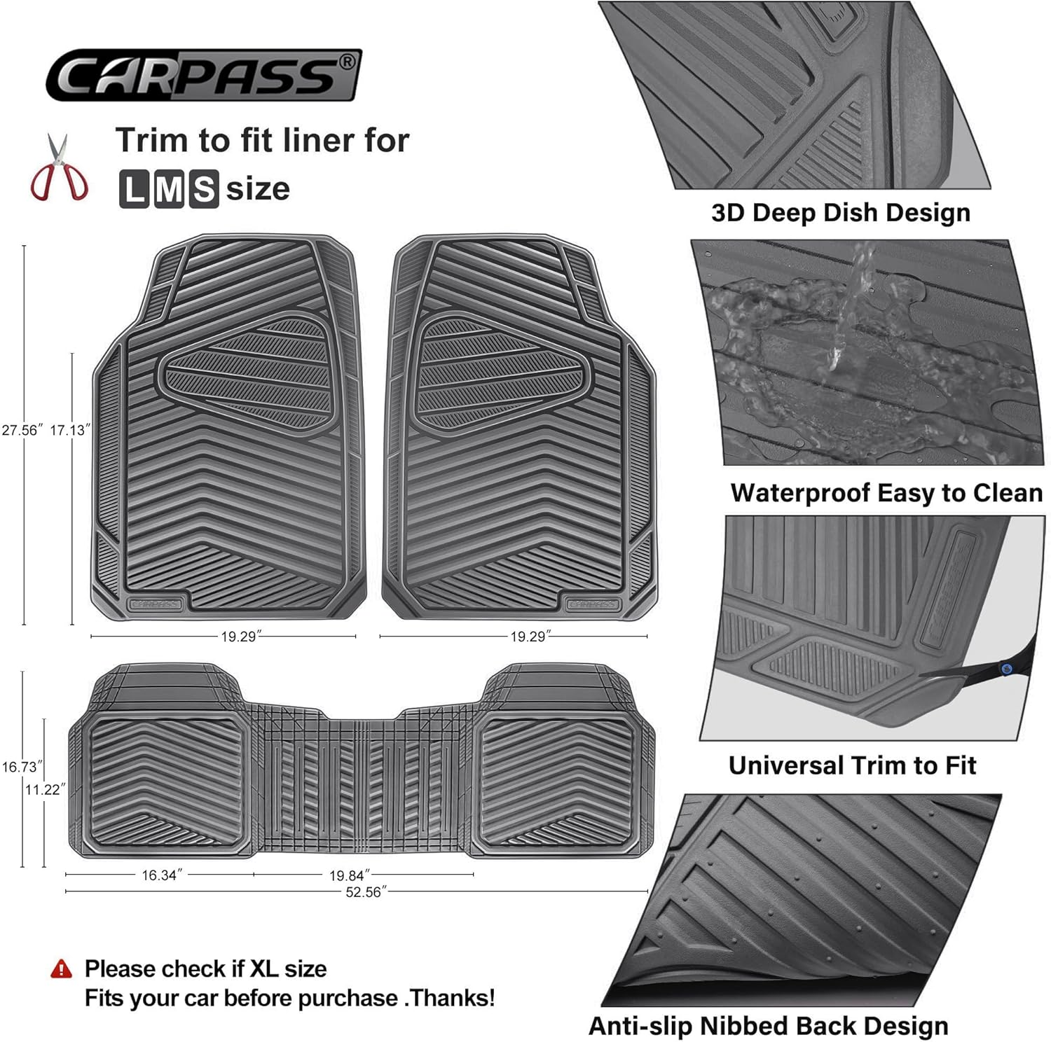 CAR PASS Rubber Car Mats,Car Floor Mats All Weather,Car Mat Full Set 3 Piece,Grey Waterproof Automotive Floor Mat Trim to Fit for Cars Sedan SUVs Small Trucks,Heavy Duty Anti-Slip Easy Clean, All Gray