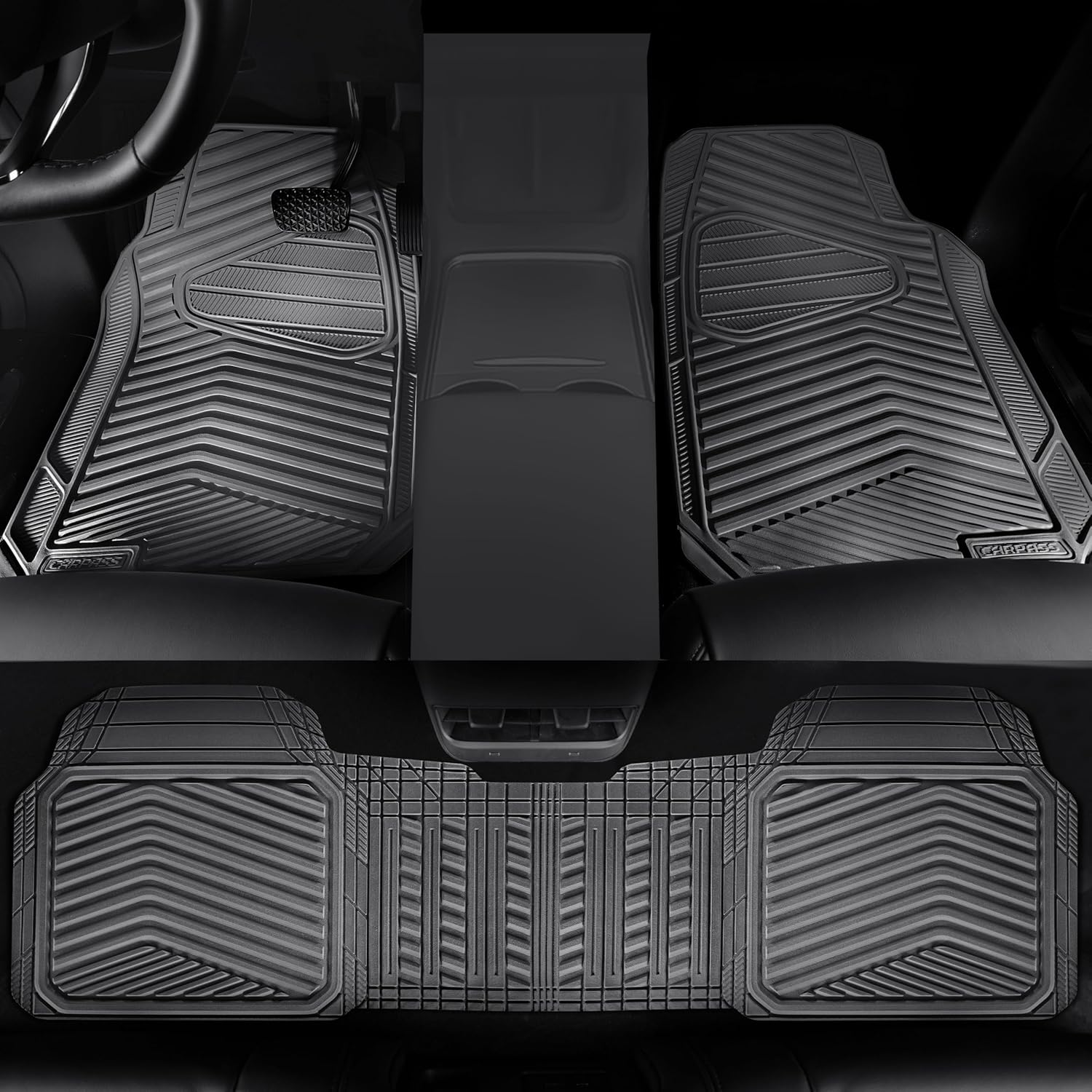 - HEAVY DUTY RUBBER ALL WEATHER FLOOR MATS: CAR PASS all gray heavy duty rubber car mats use for all season.Easy to clean. Made with FlexTough polymers that resist cracking and warping. These grey rubber car mats stay flexible yet strong in extreme temps.specifically design to prevent fluids from leaking onto carpets,the gray automotive floor mats also trap any mud, dirt, water or snow that gets in your car, Ideal for gray car floor mats for cars, gray car floor mats for small trucks, and gray all weather car floor mats needs.