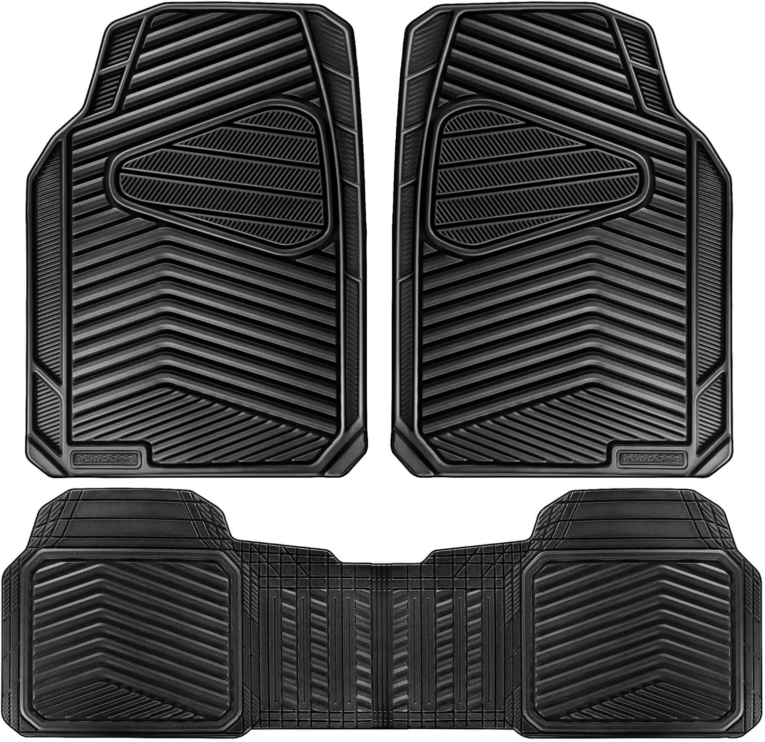 - HEAVY DUTY RUBBER ALL WEATHER FLOOR MATS: CAR PASS all black heavy duty rubber car mats use for all season.Easy to clean. Made with FlexTough polymers that resist cracking and warping. These rubber car mats stay flexible yet strong in extreme temps.specifically design to prevent fluids from leaking onto carpets,the automotive floor mats also trap any mud, dirt, water or snow that gets in your car, Ideal for car floor mats for cars, car floor mats for small trucks, and all weather car floor mats needs.