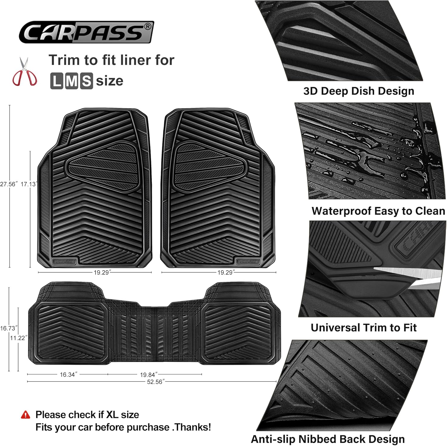 - 3 PIECE FULL SET : Includes two front floor mats and one rear mat,Please check the size data if you you're not sure if your car will fit. Front mats: 27.36" x 19.29", 1 rear mats 53.15" x 16.73". Both the front and rear seats can be cut according to your desired size.Works with most car mats full set setups and floor liners.