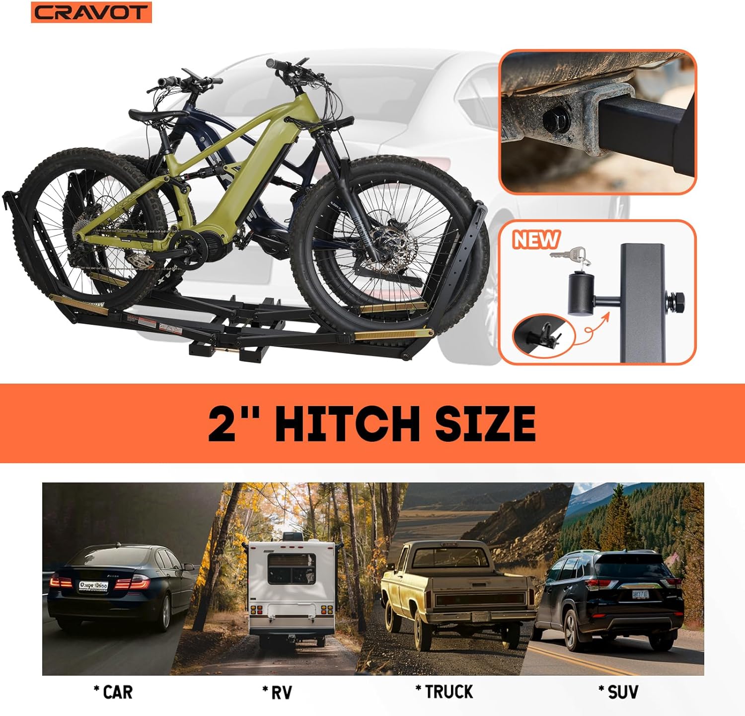- 150 lbs Capacity: CRAVOT Heavy-Duty Electric Bike Rack supports up to 150 lbs, designed to fit any vehicle with a 2-inch receiver. It accommodates electric bikes with a maximum tire width of 3.5 inches and a wheelbase up to 52 inches.