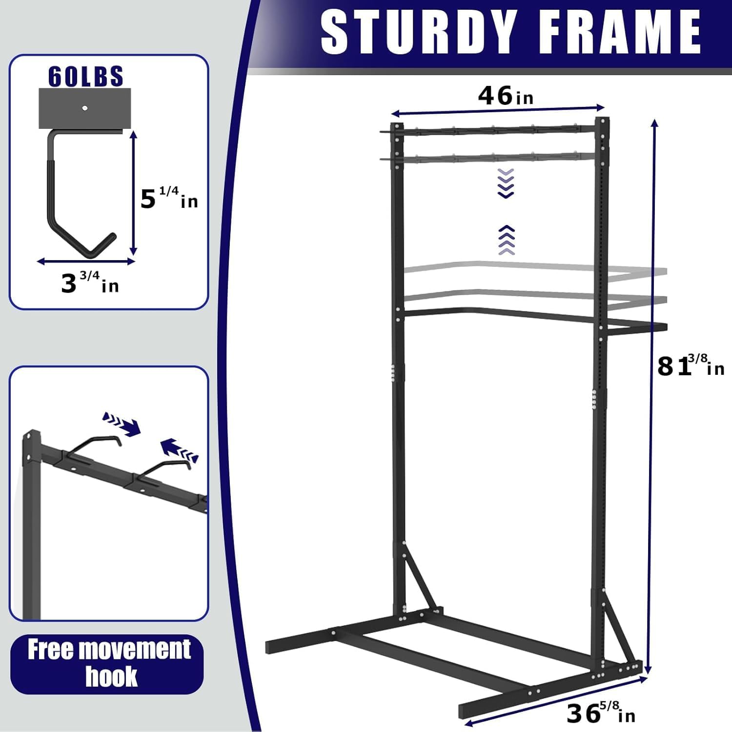 - [Customizable Height] Adjustable from 20" to 76", the rack adapts to bikes of all sizes—from kids' bikes to adult mountain bikes. Horizontal bars keep tires secure without scuffing, while locking pins firmly hold hooks in place. PVC-dipped hooks add an extra layer of rim protection during storage.