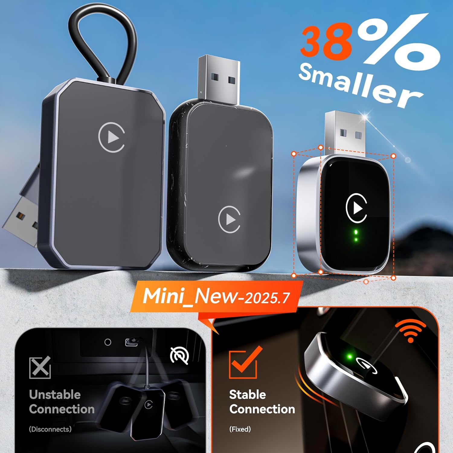 - ăUnbreakable Wireless Stabilityă Military-grade anti-shock design ends cable hassles â no broken connectors from bending or rough-road disconnects. Auto-activates instant wireless CarPlay on engine start (even in compartments). Smart power management preserves phone battery. Avoid port damage from daily plugging/unplugging and "forgotten phone" issues.