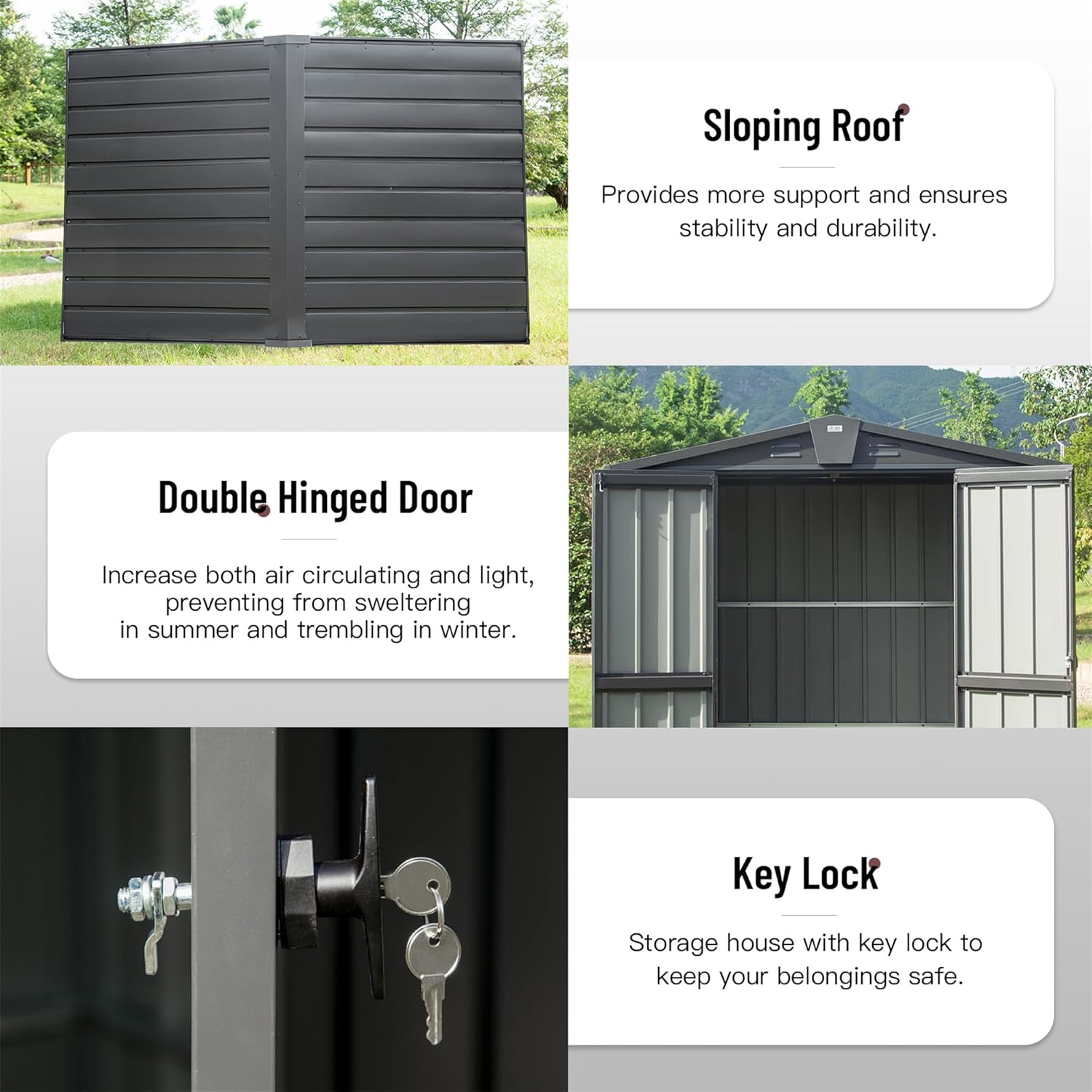 - Secure Lockable Door for Theft & Weather Protection A robust lockable door deters theft and unauthorized access, while tight seals help keep out rain and wind. The reinforced hinges and heavy-duty handle ensure smooth operation year-round, providing peace of mind for storing valuables