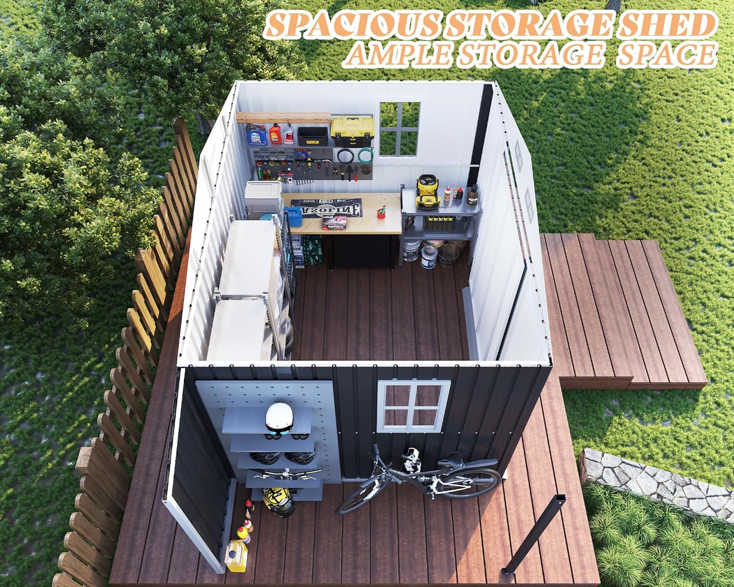 - Smooth Sliding Doors & Ramp: This garden shed features smooth-sliding doors with an integrated ramp, making it effortless to move heavy or wheeled items such as lawnmowers, generators, or wheelbarrows in and out
