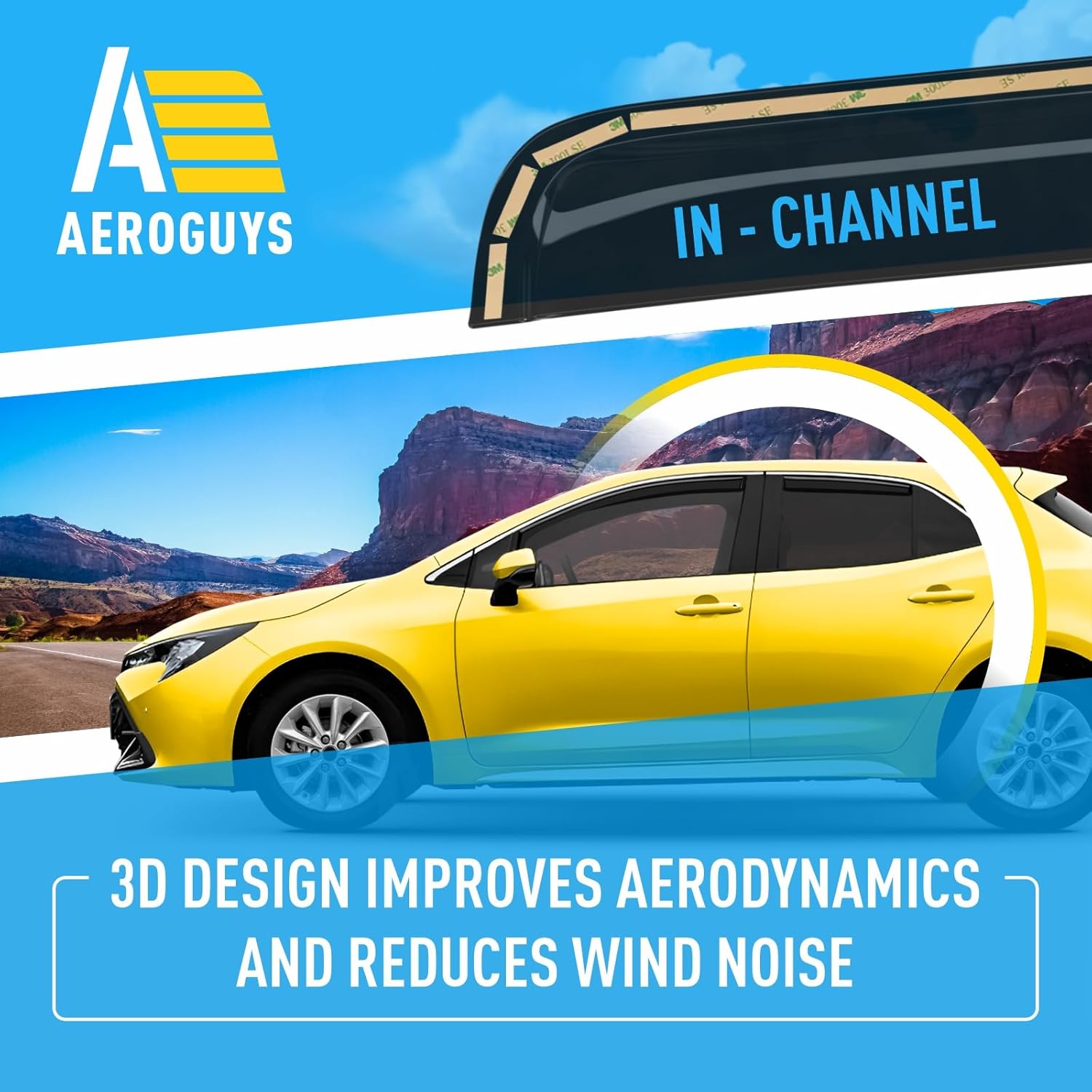 - No Tools Needed, Quick and Easy Assembly – These rain guards are very easy to fit. IN-CHANNEL INSTALLATION provides perfect fit for your car. Just slip it onto your car’s window and your job is done within minutes. There is no drilling or no tools required. Be sure that AEROGUYS window deflectors are water resistant, sun protective and will not bend, break or crack regardless of the weather conditions.