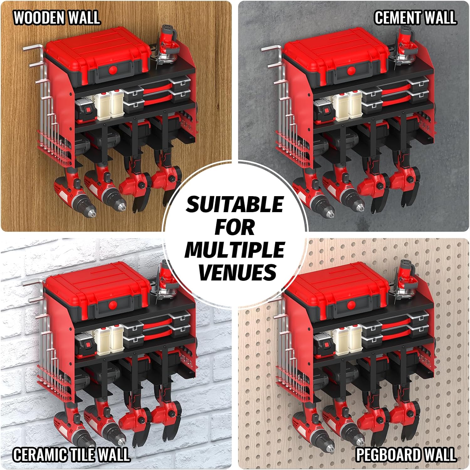 - PRODUCT UPGRADES, HIGH WEIGHT CAPACITY: hiyuehome Power Tool organizer product upgrades, power tool storage racks using solid structure and quality materials to enhance your shopping experience, wall storage racks in the middle of the components using a whole metal plate, greater enhancement of the gravity, in the transportation process and your use of the process of deformation is not easy to damage, and greatly extends the service life of the power tool holder.