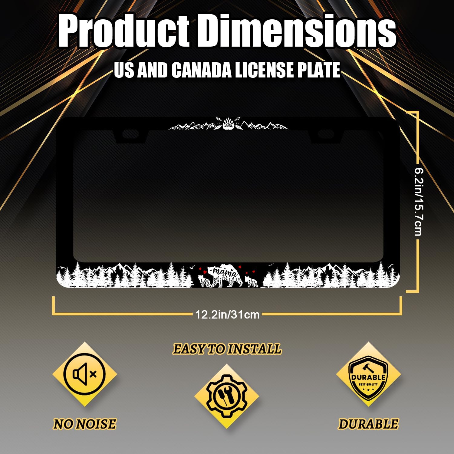 Mama Bear with Mountain License Plate Frame Forest Mountains License Plate Stainless Steel Funny Black Accessories Cars Decor 12.2 X 6.2 Inch with 2 Holes and Screws Fits Standard Us Ca Vehicles