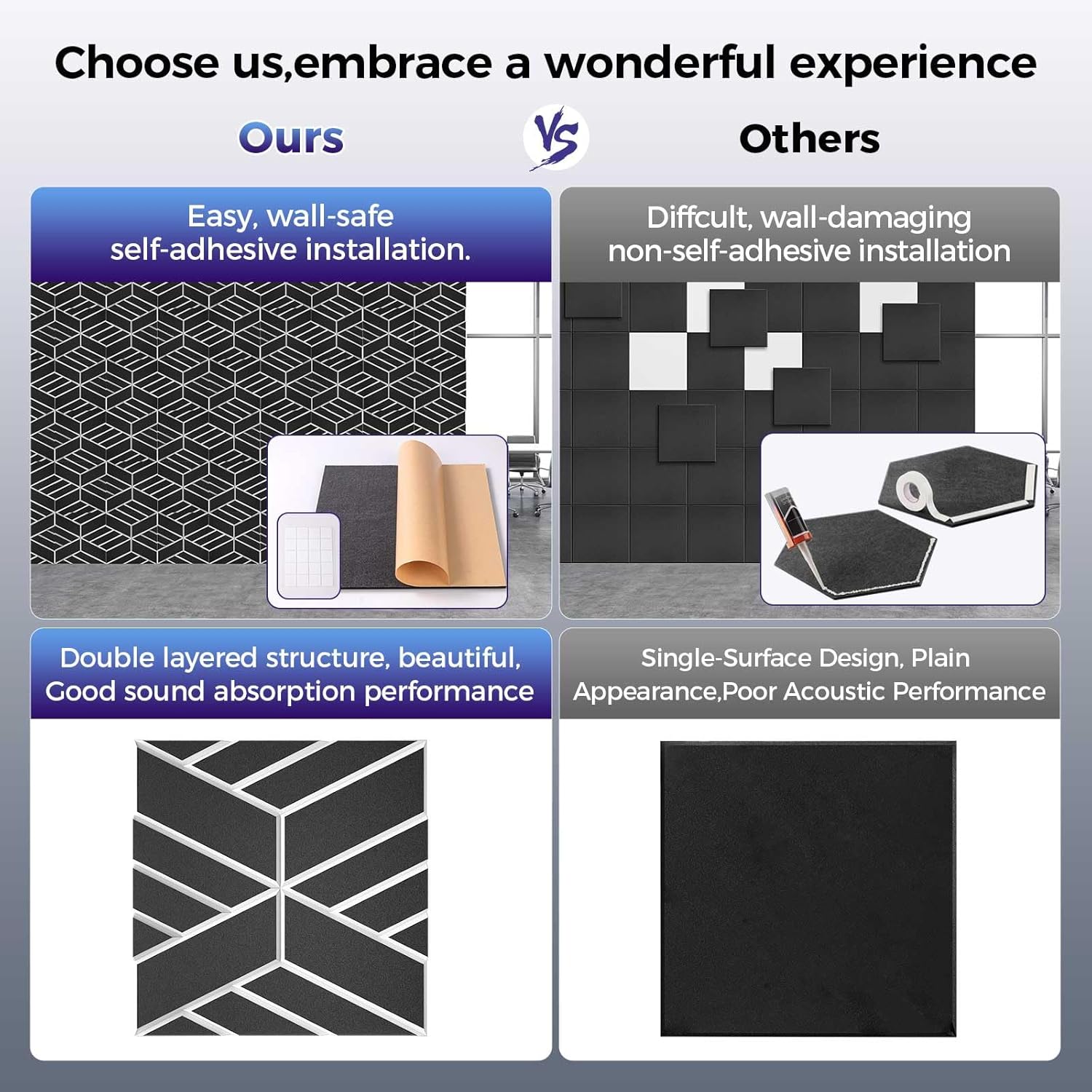 - Widely Applicable: Acoustic panels self adhesive size: 12" x 12" x 0.43", and the thickness is 8% thicker than the traditional thickness, it can provide more effective noise blocking and is suitable for a variety of high-demand environments. Suitable for home theaters, professional studios, music rooms, It can effectively improve the audio effect and enhance the work and entertainment experience in various places such as game rooms, bedrooms, offices, etc.