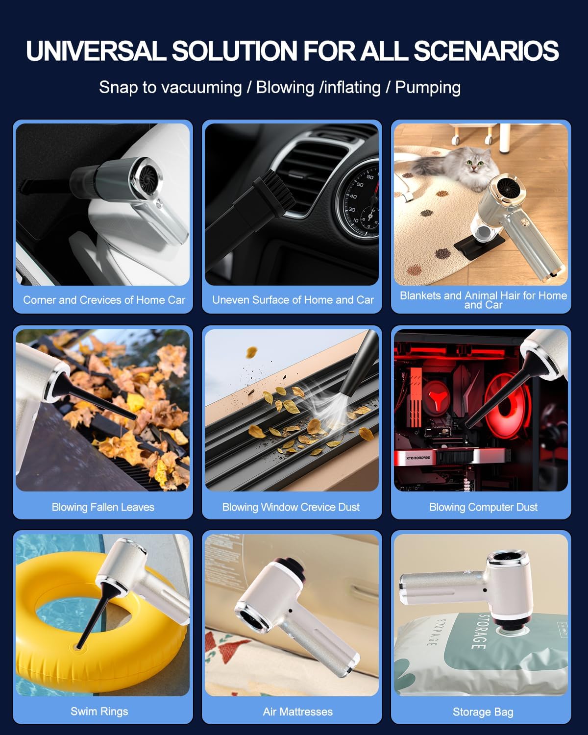 - đăPowerful Air Duster and Vacuum Cleaner 4 in 1ăfour functions: Suction, blowing, inflation, air pump, four functions. You can use it to easily blow away dirt, debris, dust, and other particles from the surface of your items, as well as to suck out the tiny stubborn dirt hidden in keyboards, corners, and crevices. in additionďź This versatile tool is more than just a vacuum cleaner. It can inflate inflatable swimming rings and air mattresses, deflate them for easy storage, and even function as a blower to remove dust from keyboards and electronic devices.