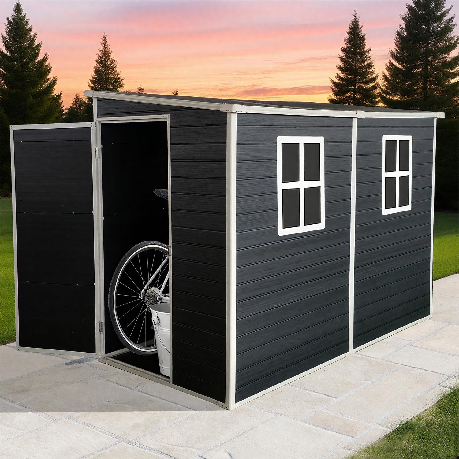 4x8 FT Outdoor Storage Resin Shed with Floor,Waterproof Plastic Garden Bike Shed with Lockable Door, Sloped Roof, Vents & Windows, Easy Assembly Tool Shed for Lawn, Backyard, Patio, Black