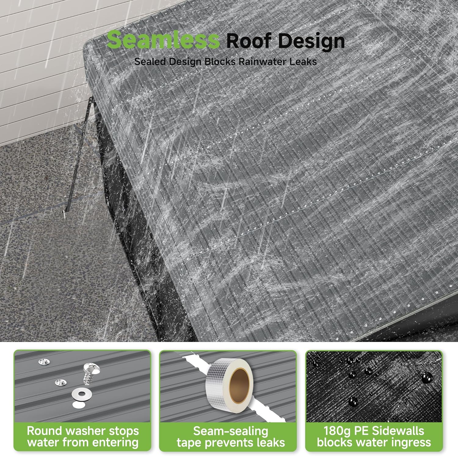- Waterproof Design: Galvanized steel sheets joined with premium waterproof tape create seamless protection. Reinforced with metal washers at every screw point, ensure complete rainwater blockage.
