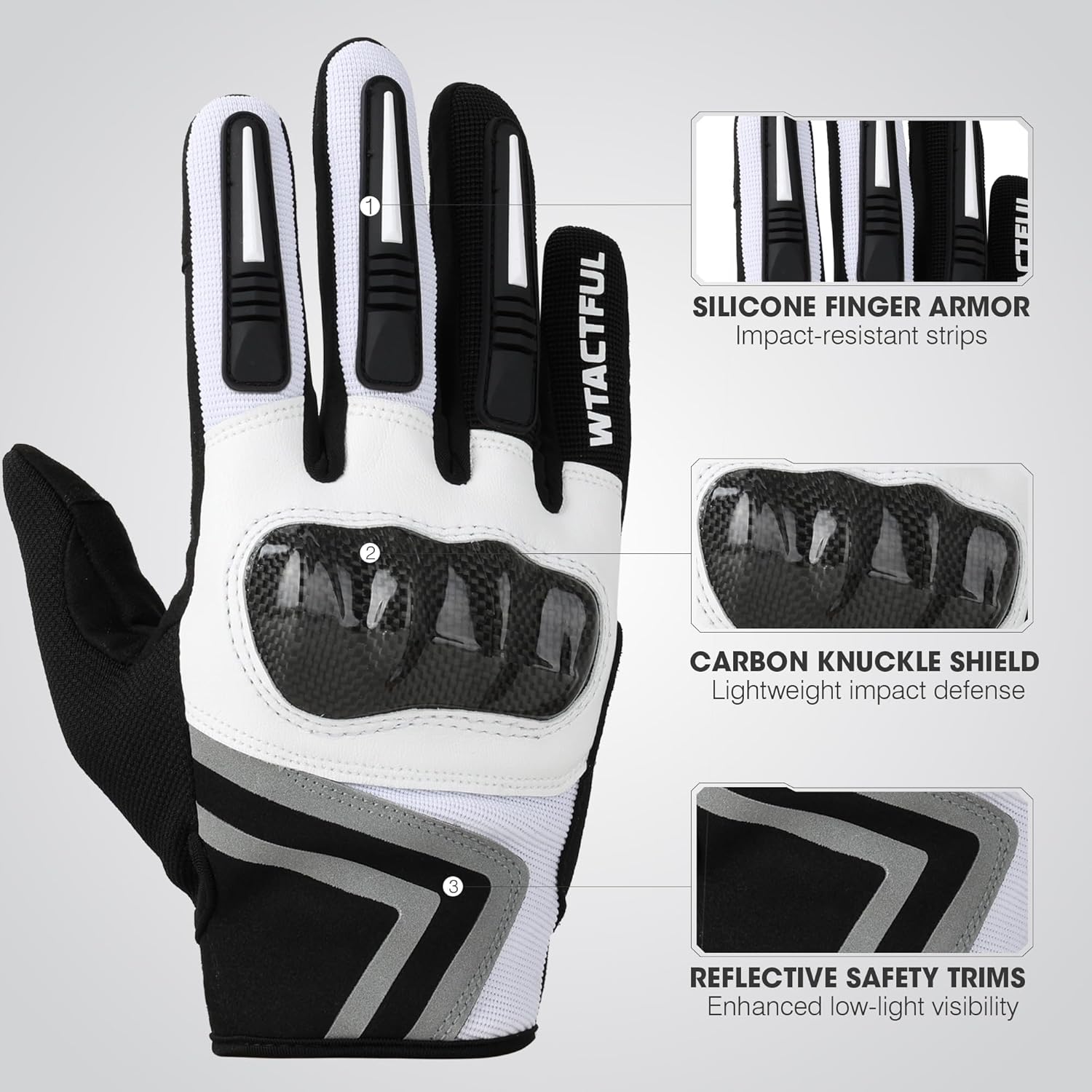 - Protective Carbon Fiber Hard Knuckle Motorcycle Gloves: Features a lightweight carbon fiber knuckle shell for impact protection, with color-matched rubber strips on fingers for added safety and style. Available in three versatile colors: classic all-black, sporty black/white, and high-visibility fluorescent green for enhanced safety.