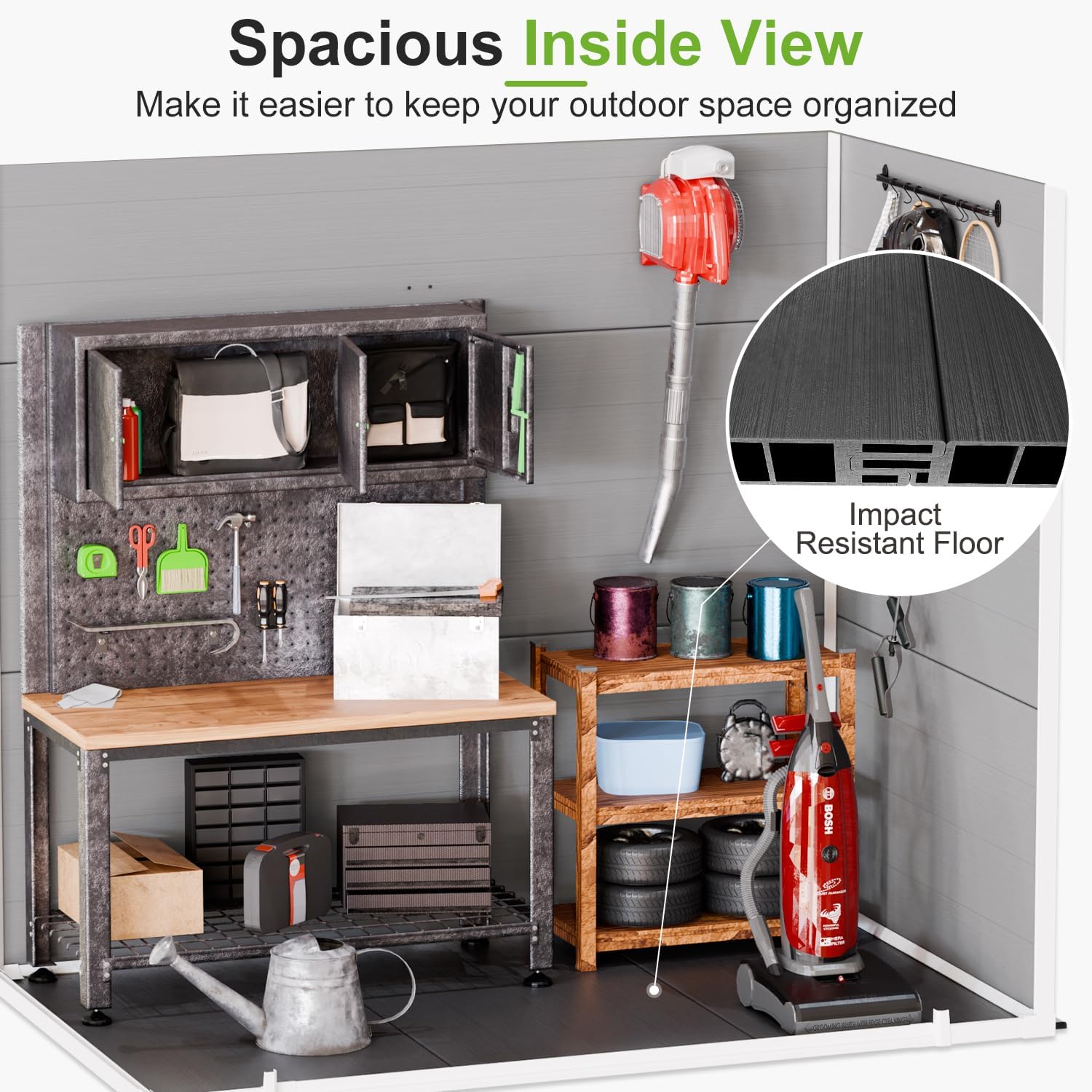 - 🏠DURABLE CONSTRUCTION & FLOOR: Made from extra thick double walled polypropylene resin construction & steel is durable enough to resist adverse weather. And the impact resistant floor is insulated from rain and insects, making the outdoor shed with floor corrosion resistant, moisture proof, and more resistant to wind and impact, ensuring that your stored items remain intact in the severe weather.