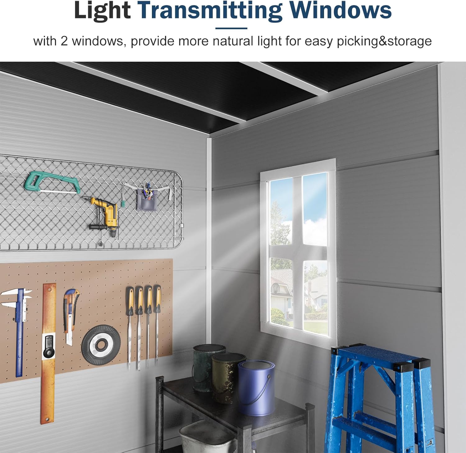 - Floor &Windows Inlcuded : The extra-wide front double doors for greater flexibility in organizing and accessing items, included shed floor,built-in ventilation prevents mold and mildew growth, enhanced safety for tools and equipment with lockable doors, Included D-Clip wall anchors to support shelves & hangers