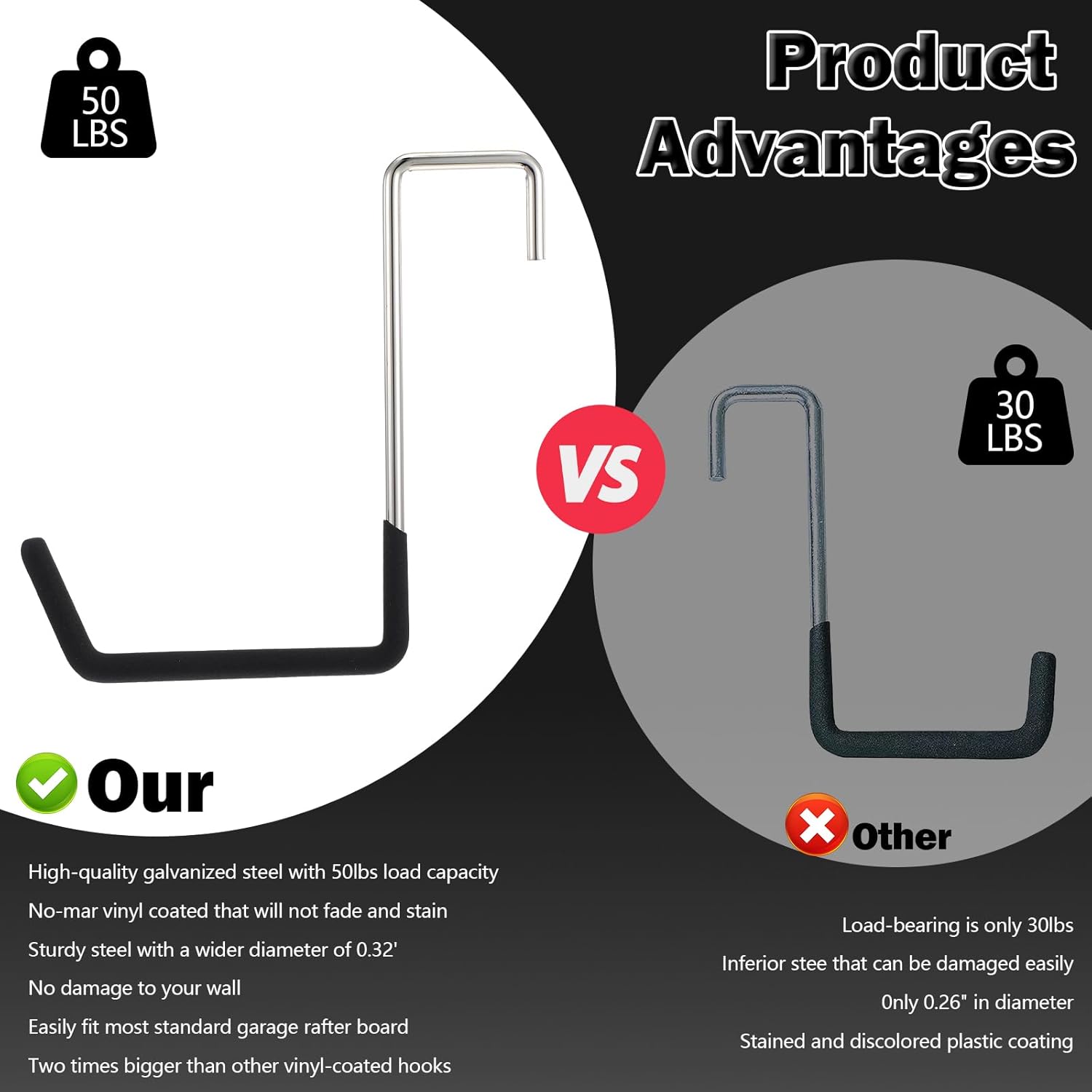 - [EAZY INSTALLATION] Our hook has a strong tough grip over rafters without the use of any screws. No holes need to be drilled. Move around easily as you wish. Save your time and ease your pain. Our sturdy hooks would easily fit your standard garage rafter board!