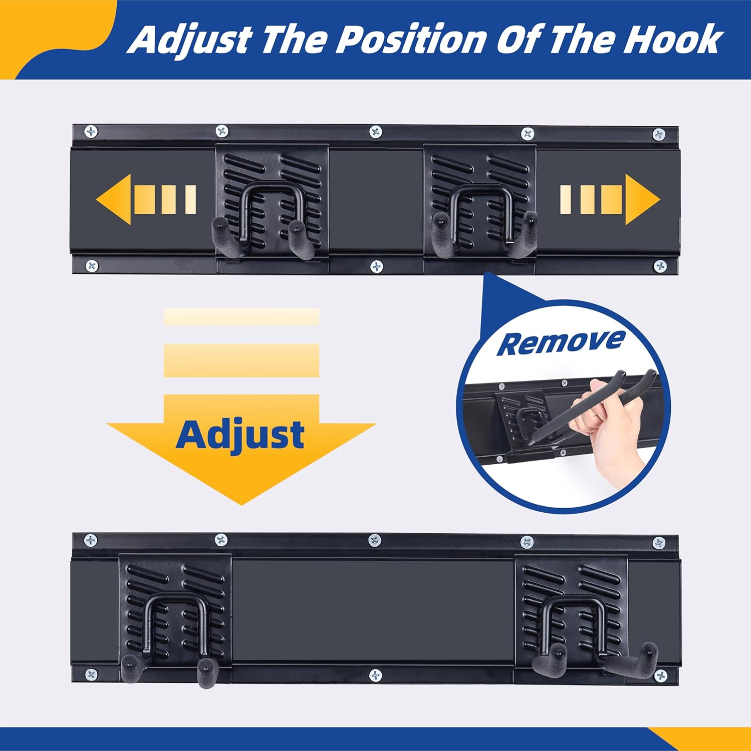 - Easy to Install & Adjustable: Our Garage Wall Organizer provides ample nails and expansion screws. You only need to use an electric drill or other tools to fix the panel horizontally to the wall and snap on the hooks. When you need to adjust the garage tool organizer wall mount spacing, the garage hooks can be easily repositioned anywhere on the panel track to meet personal needs!