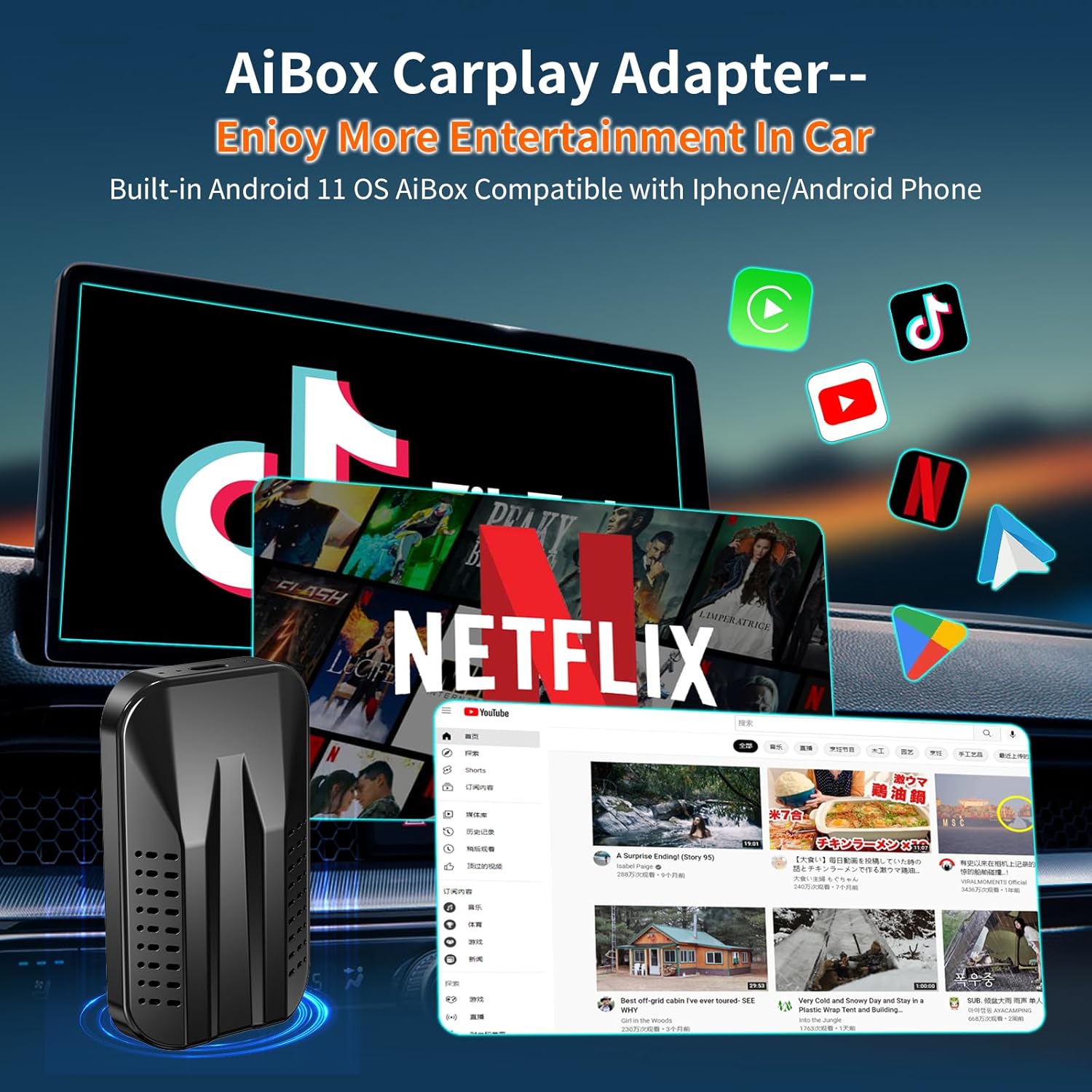 - 【Wireless Carplay with Netflix YouTube TikTok】Wireless Carplay Adapter Netflix makes your car more entertaining, giving you a cinematic experience. Wireless Android Auto adapter has built-in Netflix YouTube and TikTok. Transform your drives into an entertainment hub by streaming your favorite content directly to your car's display. Experience Seamless Connectivity Without Delay. Insert a TF card for offline video and music playback, ensuring boredom is never an option.