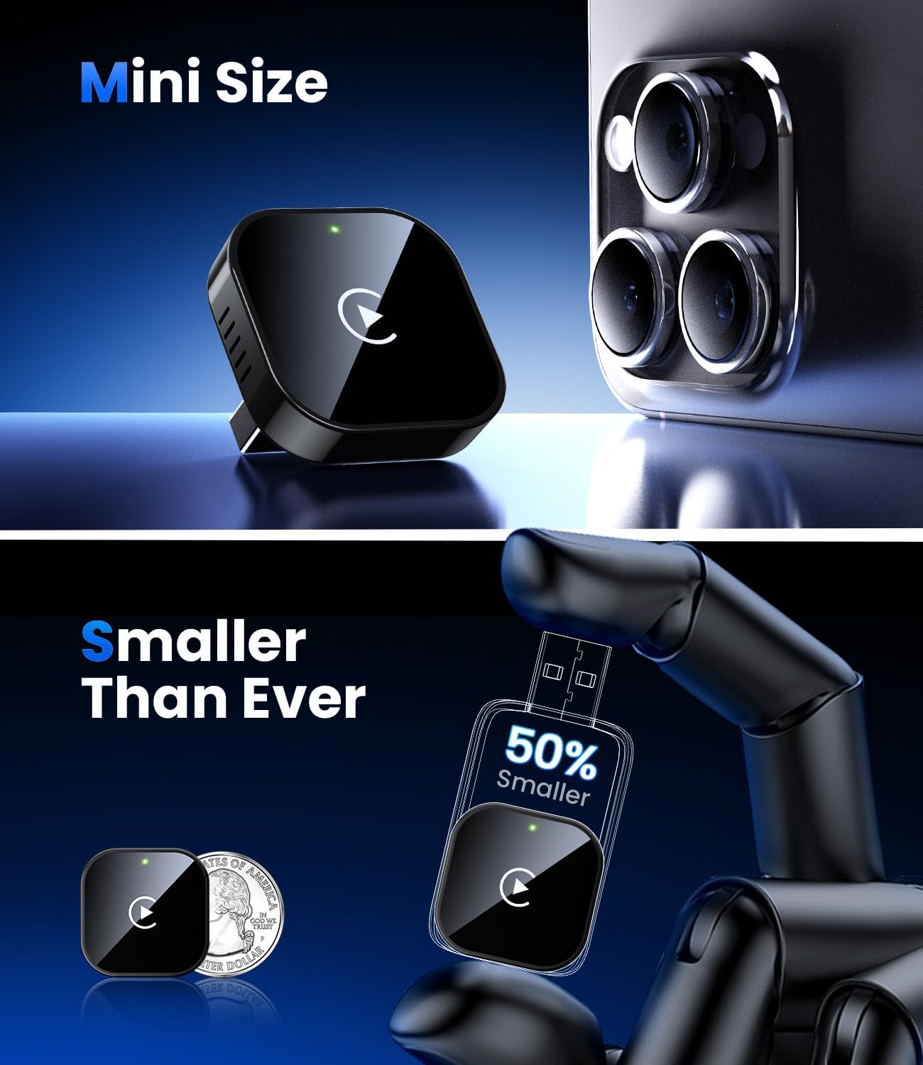 - 🏆 Revolutionary Mini Design, 50% Smaller – The ultra-compact and sleek Teeran wireless CarPlay adapter fits almost flush in your car’s USB port, blending seamlessly into your vehicle’s interior for a clean, minimalist look without clutter. With our upgraded, nearly invisible adapter, effortlessly add wireless functionality to your car's original Apple CarPlay and enjoy wireless access to CarPlay features like music, maps, calls, and more.