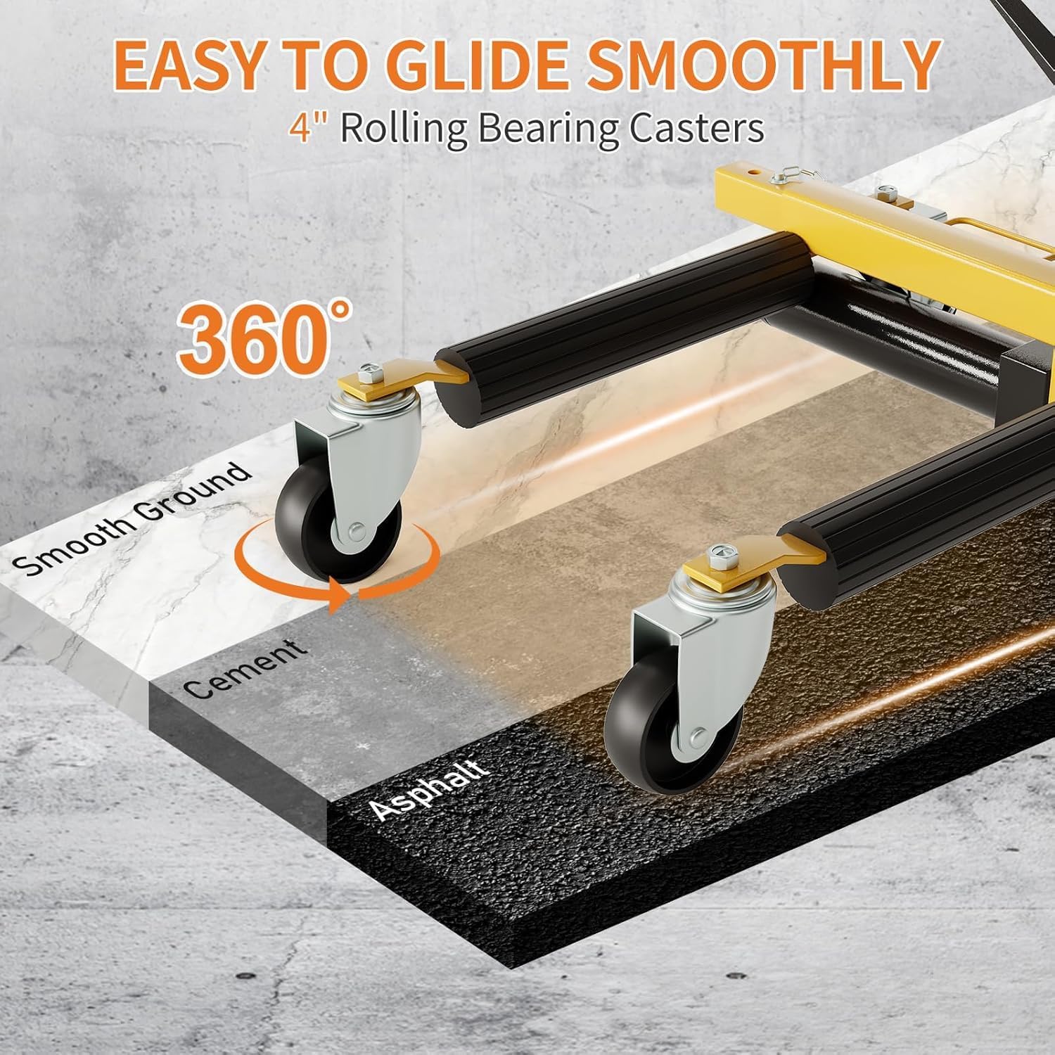 - Hydraulic Lift System for Effortless Operation:Featuring an advanced hydraulic oil pump mechanism, this dolly lifts vehicles 40% faster than traditional pedal ratchet systems. Enjoy reduced manual effort and minimized fatigue, making tire changes and maintenance a breeze.