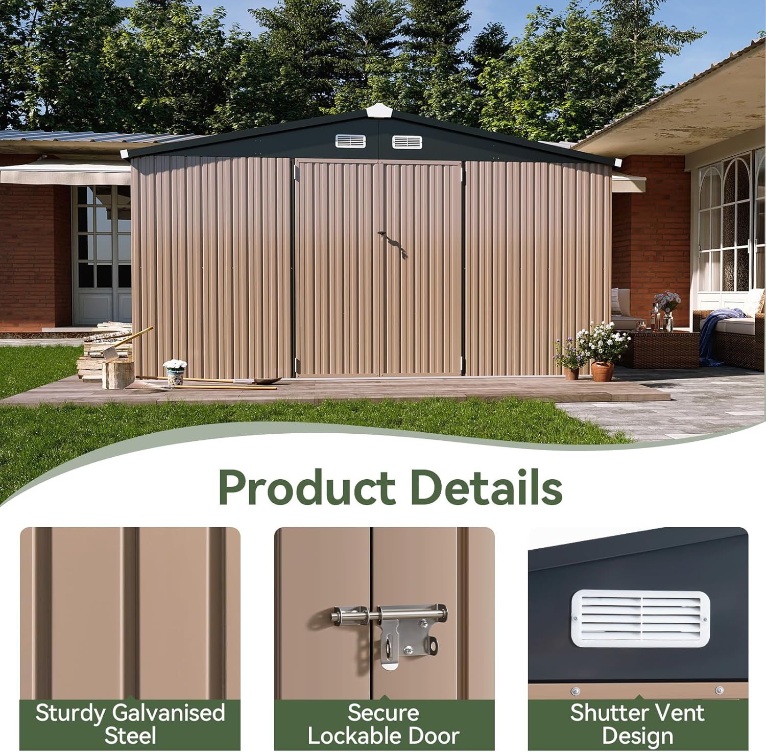 Aoxun 12x10 FT Shed Outdoor Storage Shed with Spacious Doors, Large Shed Steel Utility Tool Shed Storage House with Door & Lock, Metal Sheds with Sloped Roof for Garden Patio Lawn Poolside, Brown