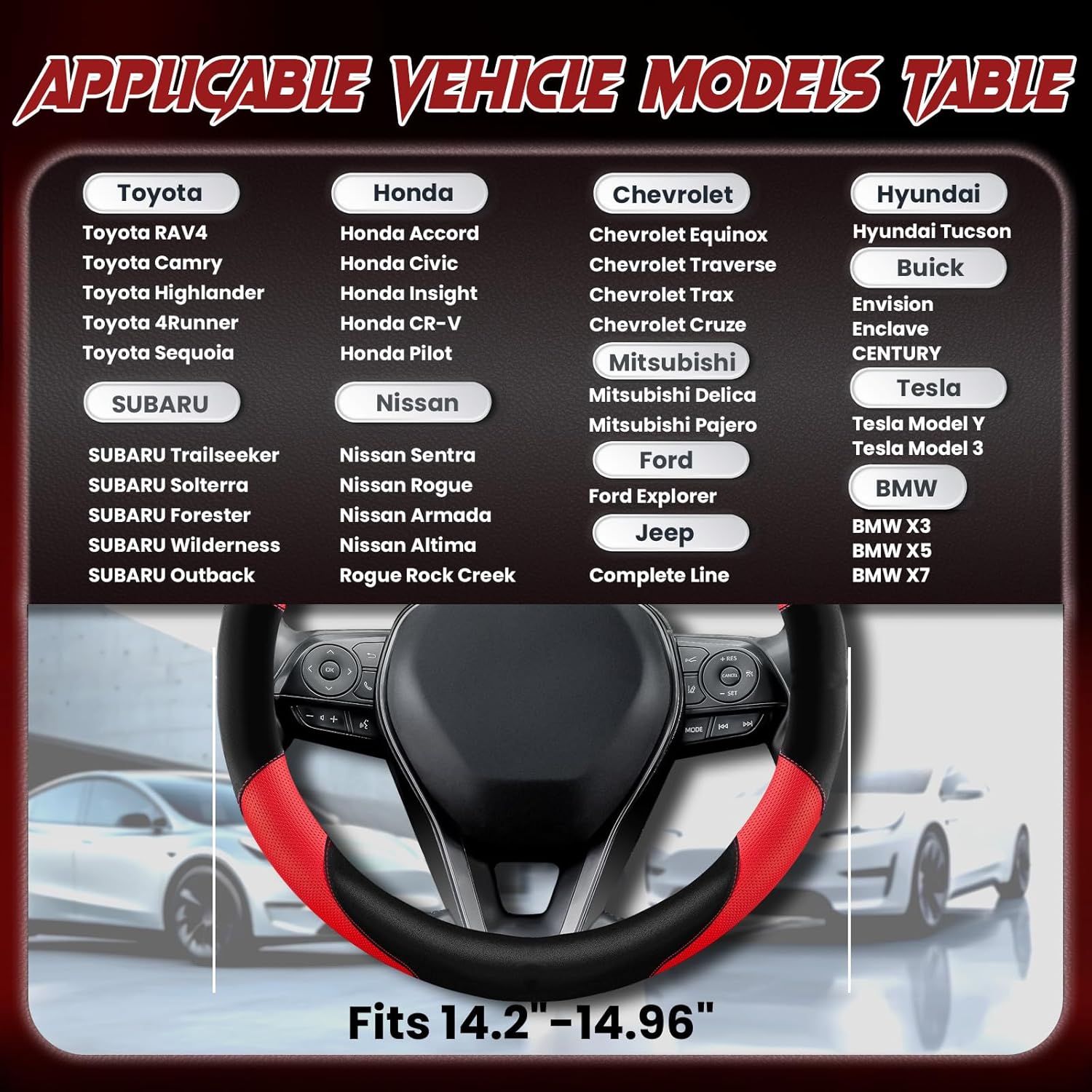 - UPGRADE CAR INTERIOR CLASS:The bold black and red accents elevate your interior with sporty sophistication, featuring a premium steering wheel cover that combines dynamic styling with ergonomic comfort. Its subtle textured grip enhances control precision while complementing upscale cabin aesthetics for a seamless driving upgrade.