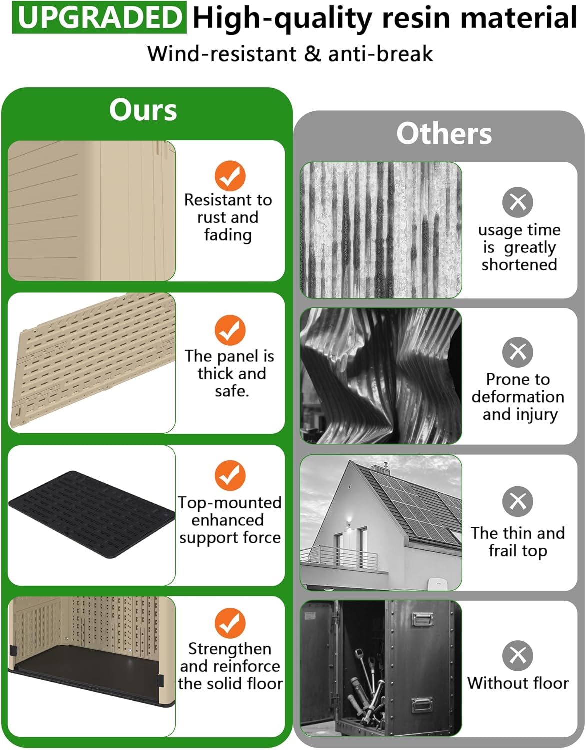 - All-Weather Durability for Your Outdoor Storage Cabinet: Constructed from high-quality, weatherproof resin, this outdoor storage shed is built to withstand harsh weather conditions. It provides reliable protection against rain, UV rays, rust, and general wear and tear, ensuring long-lasting use and maintaining its appearance over time, making it an ideal waterproof outdoor storage cabinet.